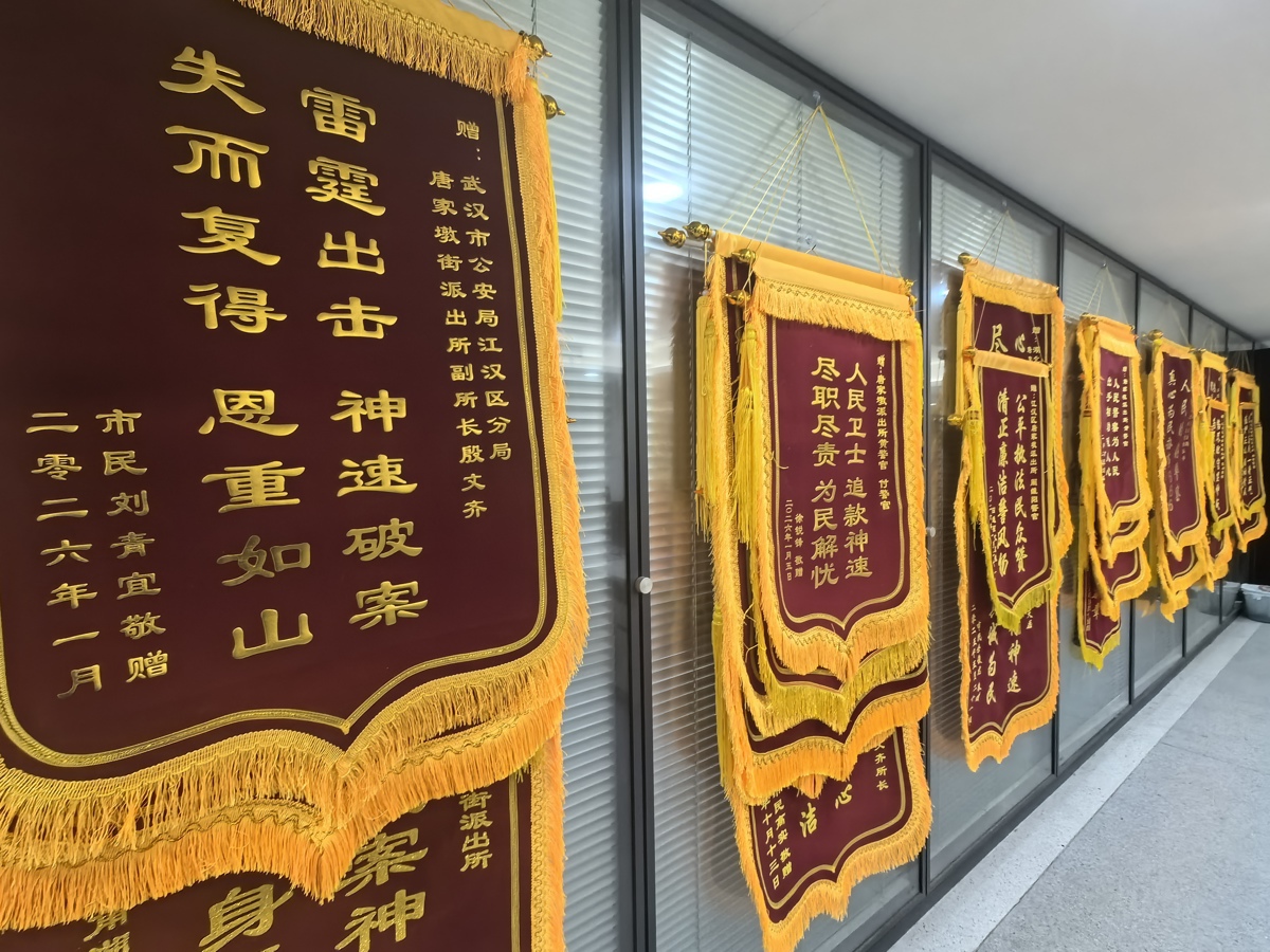 在办公室外一面墙上,密密麻麻挂满了锦旗,“破案神速暖民心”“执着追逃显担当”“为民服务尽职责……”每一面锦旗背后,都是一起群众关切的案件、一段全力以赴的坚守,更是辖区群众对殷文齐和派出所民警工作的认可与信赖。