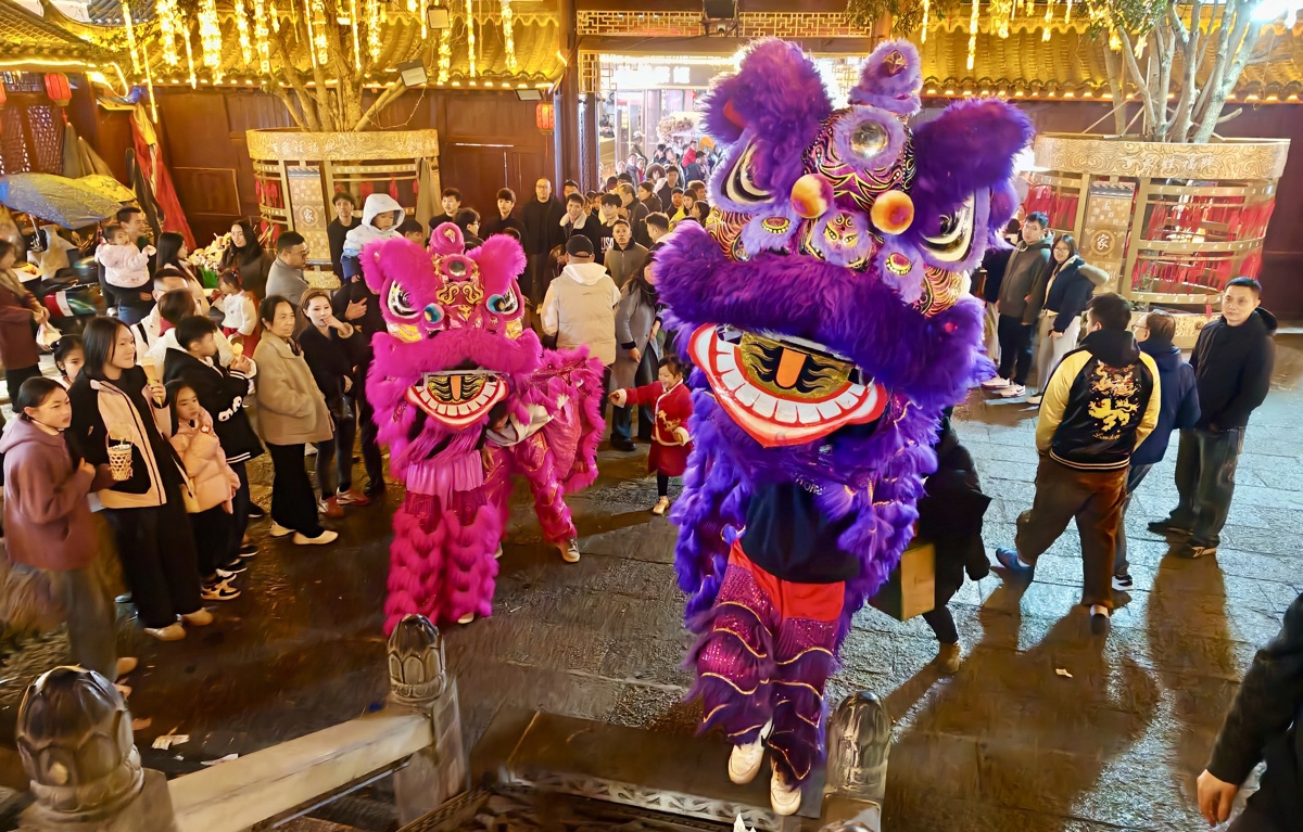 夜幕降临,西街沿街红灯笼高挂,古街与现代商铺相映成趣,人流络绎不绝。街区内舞狮表演轮番登场,锣鼓铿锵、瑞狮腾跃,时而摇头摆尾送福,时而登高采青贺岁,引得游人纷纷驻足拍照、掌声不断。民俗展演与互动体验同步开展,游客沉浸式感受壮乡年味,传统年俗与漓江风情相融,让新春更具文化韵味。