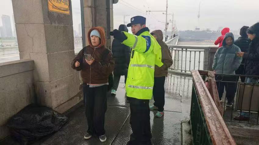 2月16日一早,黄鹤楼公园与长江大桥迎来大批游客,几名游客因寒风徘徊在警务室前,武昌区分局巡特警大队民警姚笛立即上前,将他们请入室内送上热水和零食,细致指引游玩路线。“警灯闪耀在长江大桥上,看着就让人安全感满满。”游客小涂笑着走出警务室,在黄鹤楼下拍下藏蓝身影与黄鹤楼同框的照片。此外,武昌区分局PTU轻机动警队携警犬,在汉街、昙华林等人流密集景点开展常态化武装巡逻,与“黄鹤卫士”义警队伍联动协作,织密平安防护网。