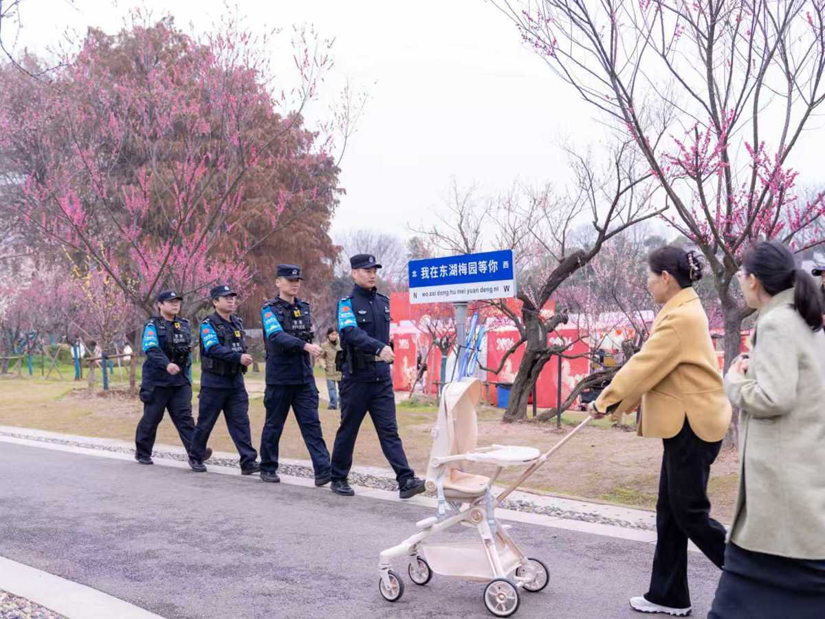 2月18日,春节假期第四天,全市景区客流持续攀升。在东湖生态旅游风景区,2万余株梅花正值盛放期,八方游客踏青寻梅,人流如织。东湖生态旅游风景区分局巡特警大队民警幸鑫与同事们启动“旅游高峰勤务”,穿行在花海之中,时刻守护游客安全。“背包拉链要拉好,手机不要放在外套口袋里。”每遇到驻足合影的游客,幸鑫都会耐心提醒,让游客在领略梅花雅韵的同时,真切感受到“警察就在身边”的安全感。