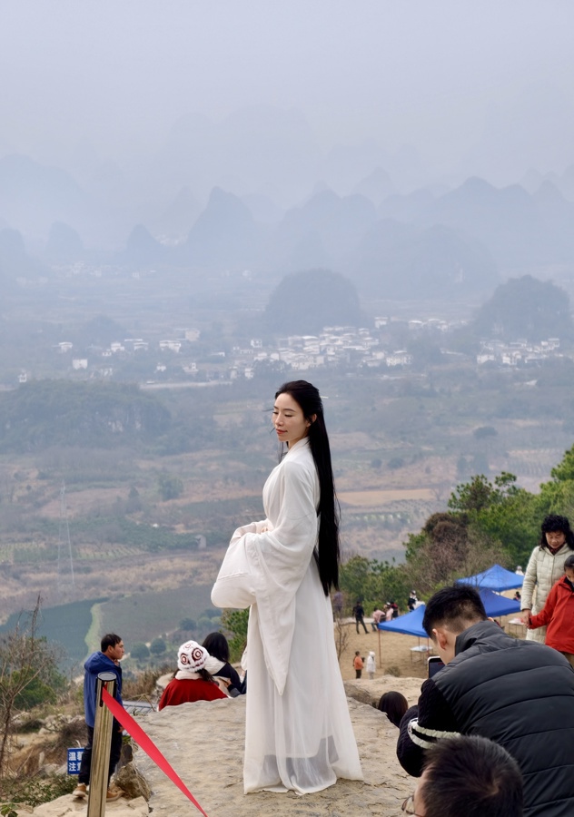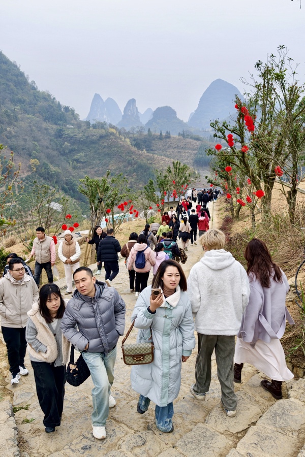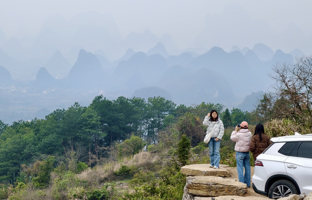 马年新春,广西阳朔文旅市场持续升温,位于葡萄镇杨梅岭的千里江山图大型水墨画打卡地凭借酷似北宋名画的喀斯特峰林景观,成为游客网红打卡点。