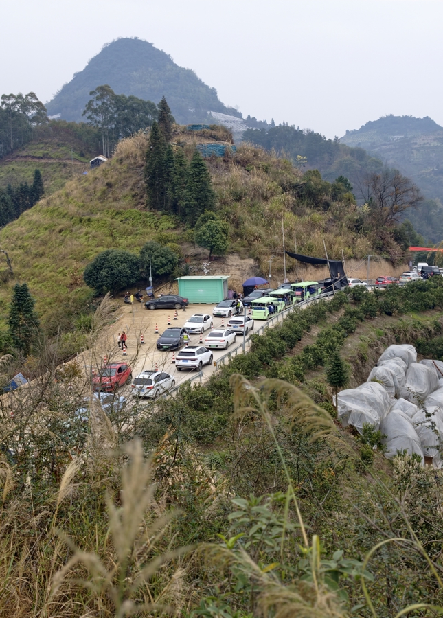 2月18日,记者在景区看到,来自全国各地的车流、人流攀升,景区出现短时车辆拥堵,不少游客选择将车停在半山腰的一号停车场,步行前往观景台,从容赴一场山水之约。