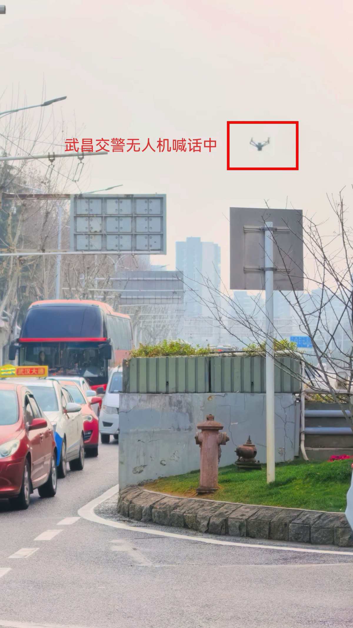 一架“警眼”无人机一直在空中巡飞,反复播报:武昌交警提醒,黄鹤楼景区停车场需提前预约,请已预约车辆在右侧车道有序排队。