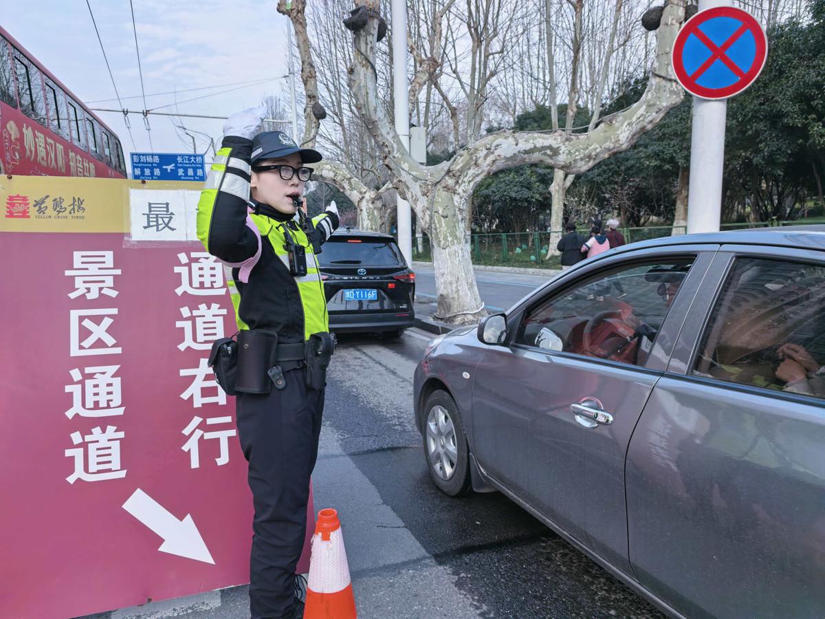 2月19日,大年初三,黄鹤楼景区的游客明显增多。武昌交警出动无人机监控路面,路口民警佩戴AI眼镜识别车牌号,快速判断车辆是否预约进行引导、分流。当日截至下午5时,黄鹤楼公园东门停车场出入车辆1660车次,周边交通始终平稳有序。