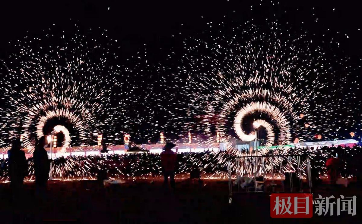 夜幕降临,打铁花、电音派对、篝火晚会等活动轮番上演。打铁花艺人挥臂击棒,铁水泼向夜空,万点金雨簌簌坠落;火壶表演者双手翻飞,烈焰喷涌数米高;川剧变脸演员走下台,扇子一甩,瞬间变脸。