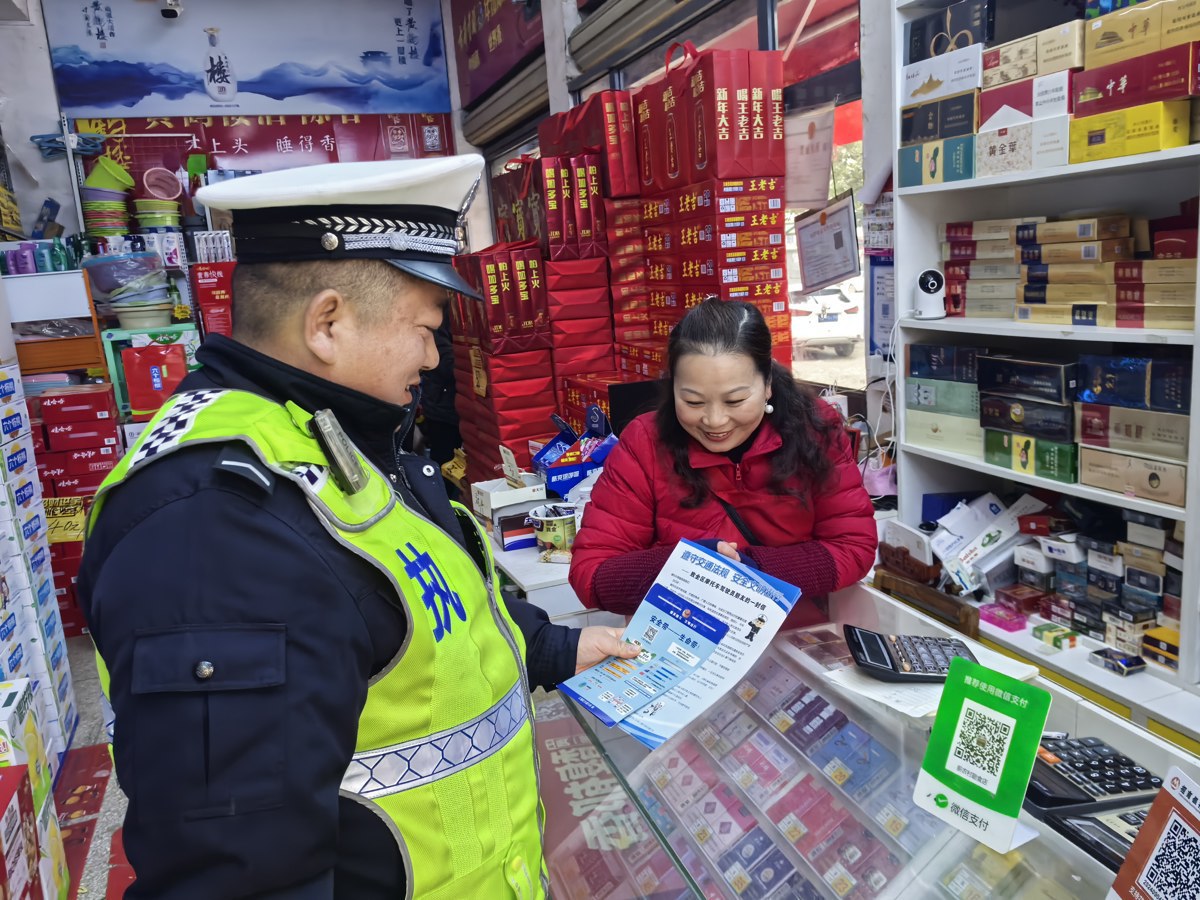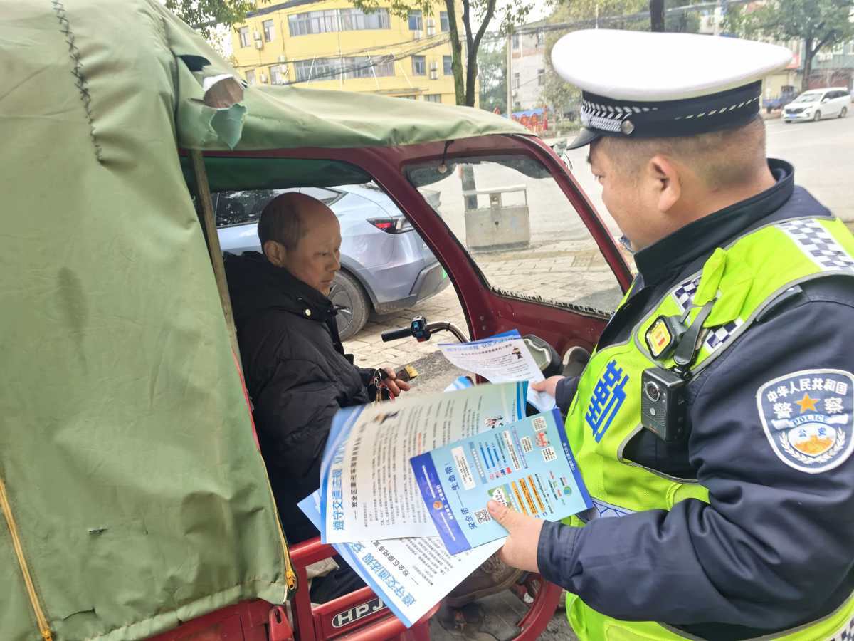 2月17日,大年初一的晨光刚洒向山坡街光星村新农村,劝导员李涛、胡先明就已驻守在山舒线主干道旁。“伙计,春节聚餐开心,但‘开车不喝酒、喝酒不开车’可不能忘!”面对正要走亲访友的村民,李涛递上印满安全知识的宣传册,用接地气的家常话反复叮嘱。针对农村出行高频风险,他们重点提醒驾驶员系好安全带、杜绝超员逆行,告诫村民切勿乘坐无牌无证车辆;遇到准备骑三轮车出门的农户,胡先明更是手把手示范安全驾驶要点:“转弯前多回头看看,村口人多车杂,慢一点才安全!”当天,两人累计劝导违规行为9起,39份宣传资料带着平安祝福送到村民手中,成为新春里最珍贵的“礼物”。