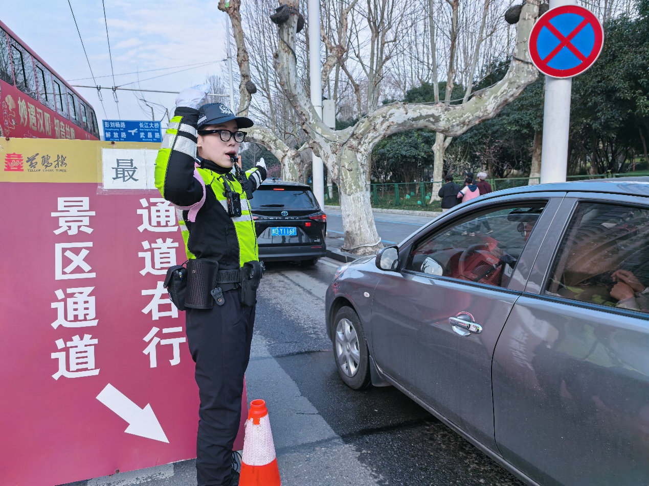 大年初三,执勤交警依托职能警用装备,对当日进入黄鹤楼停车场的1600余台车辆进行精准引导分流,景区周边道路通行效率得到大幅提升。