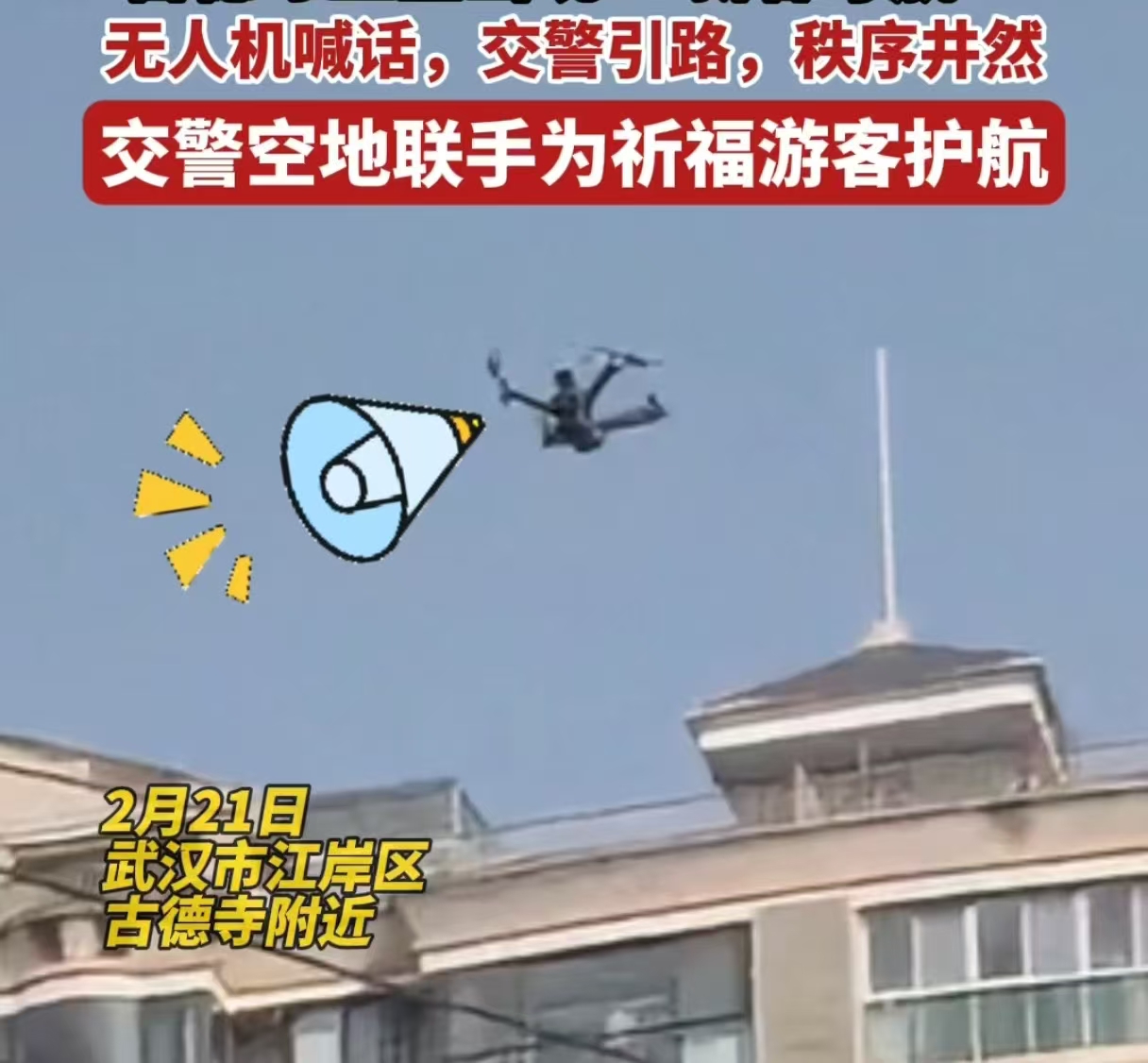 “亲爱的游客朋友,新年好!江岸交警给大家拜年啦……请即停即走,有序停放至周边停车场。”正月初五,古德寺、巴公房子等网红打卡地客流爆满。为了让游客的新春出游路更顺畅,江岸的“空中交警”向游客们喊话引导。