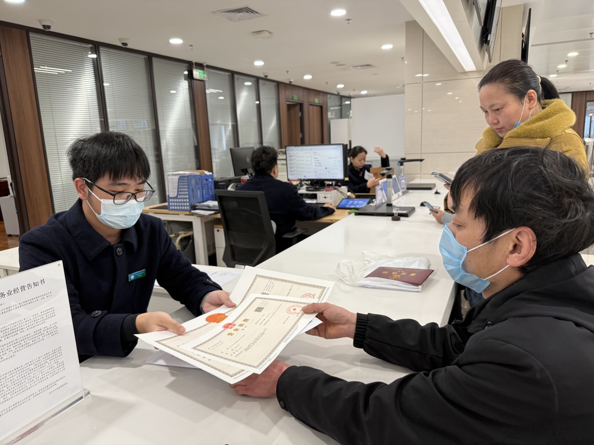 三楼的企业办事窗口同样忙碌。来自安徽的王先生和妻子昨天专程从安庆赶到武汉,就为了在开工第一天顺利办好新的营业执照。夫妻俩在武汉生活了20多年,两年前来到东西湖加盟经营一家早餐店,主要做包子、小吃。今年他们计划开辟线上业务,上线外卖平台,需要办理营业执照变更手续,同时还想办理经营者变更手续。从9点开始办理业务,10点左右,王先生便顺利拿到了新执照。“新年新气象,希望生意红火,办完事马上就能上线平台了。”王先生笑着说。他特别提到,全程都有工作人员引导,每一步都有人指引怎么做,非常便捷。