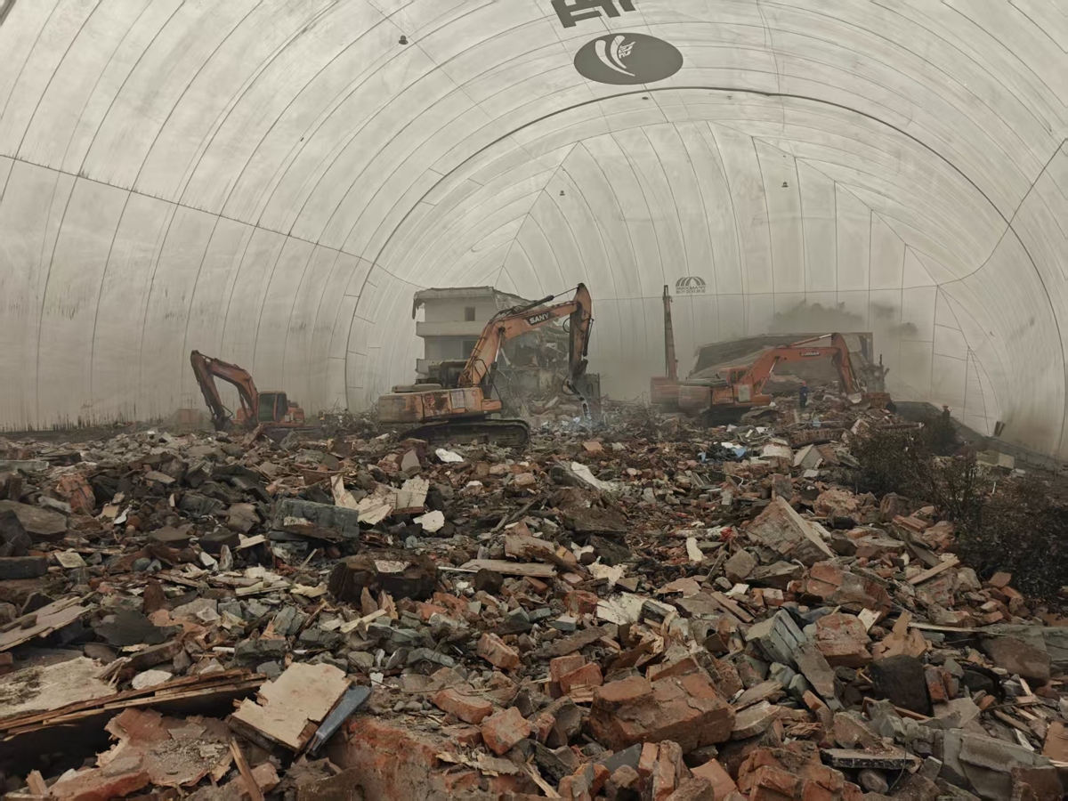 今年1月初,经过多方验证后,施工方选定了气膜结构。2月10日,气膜结构安装到位。传统露天拆除作业的粉尘扩散、噪音污染、天气制约等问题迎刃而解,实现了在不影响水厂正常供水、不破坏水源地生态的前提下,实现了拆除作业的安全、洁净、高效推进。