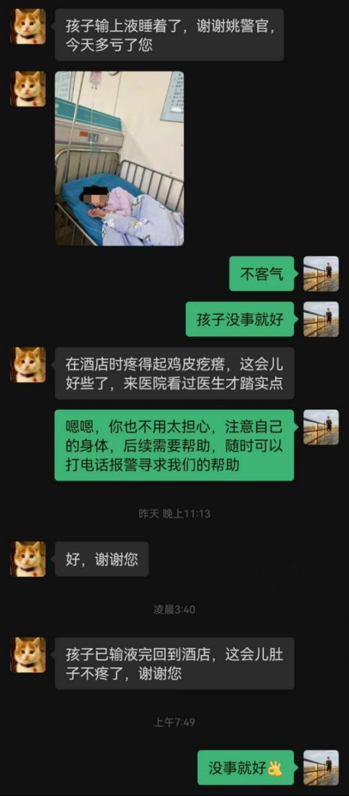 “喂,你好,我女儿食物中毒了,我叫不到车,麻烦你们能帮帮我们吗?”2月15日晚9时许,一阵急促的电话铃声打破了新村街派出所值班室的宁静。值班民警姚谌喆火速赶至酒店,只见母亲跪地抱女,孩子脸色苍白。他小心将女孩抱上警车,拉响警笛,6分钟后抵达儿童医院。送进急诊安顿好后留下电话:“有事随时打我!”凌晨3时,万女士发来短信:“孩子平稳多了,太感谢您了!”