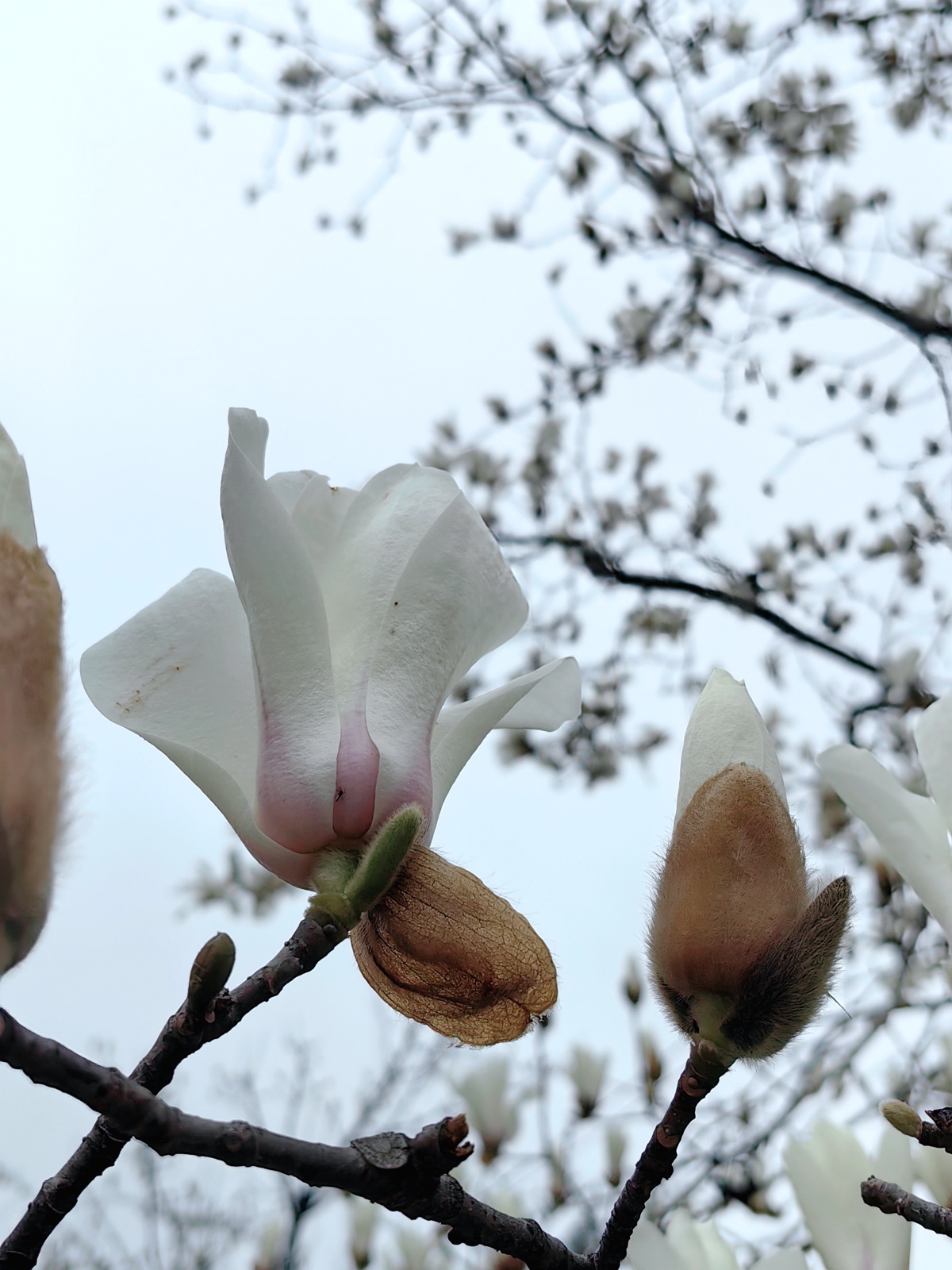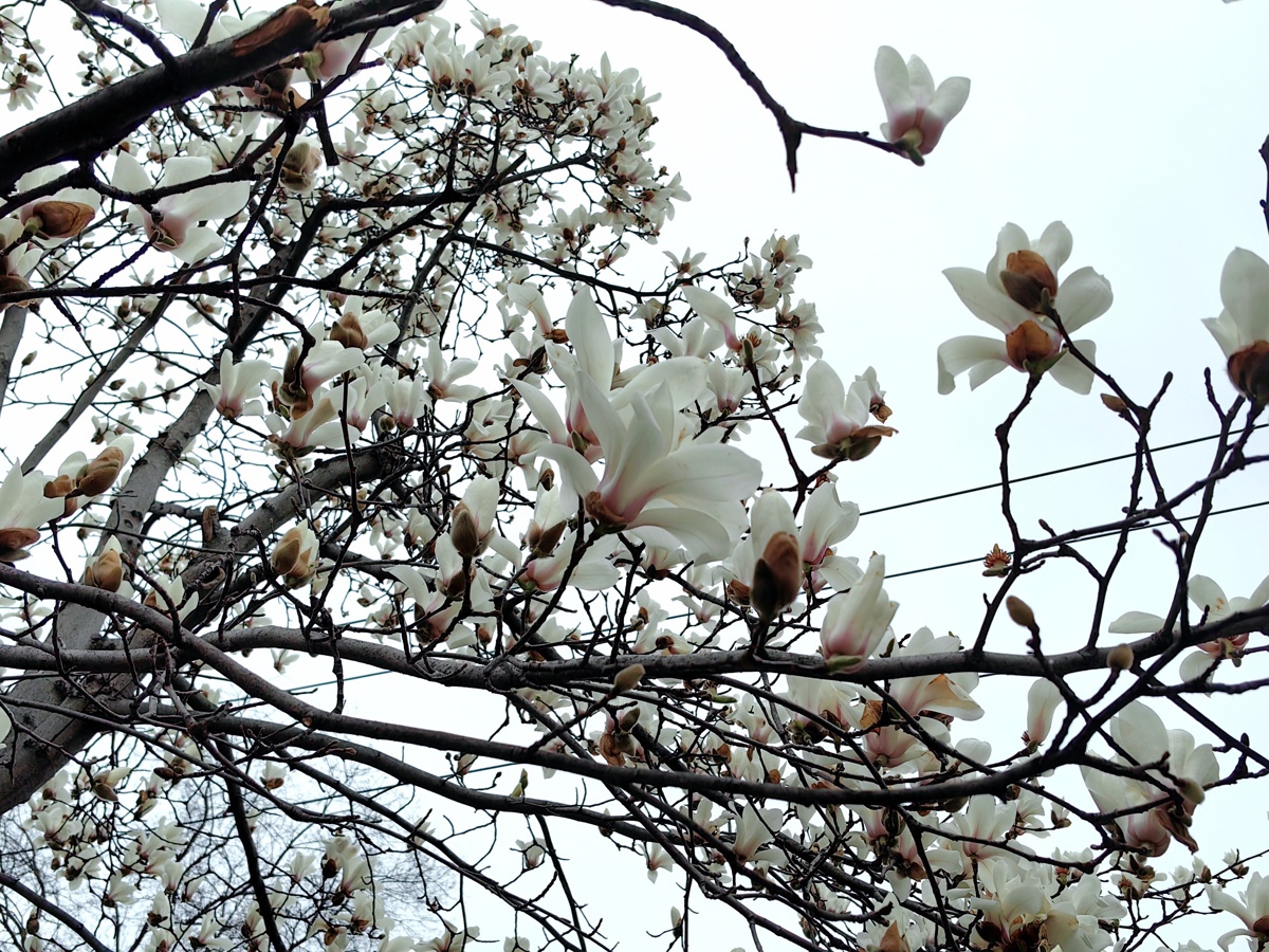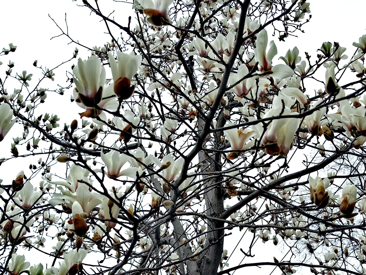 2月25日,和平公园内,道路两旁的玉兰树整齐排列,满树繁花如云霞堆叠。有的花瓣完全舒展,露出嫩黄的花蕊,似白鸽振翅欲飞;有的含苞待放,裹着褐色的花萼,透着几分娇羞。枝干遒劲舒展,与洁白花朵相映成趣,在灰蒙的天空下勾勒出一幅写意的春日画卷。