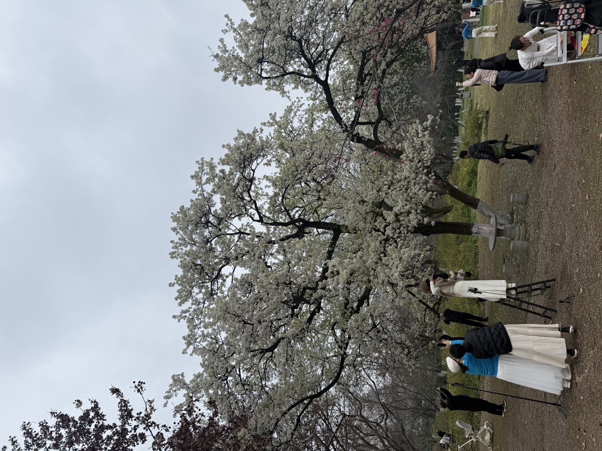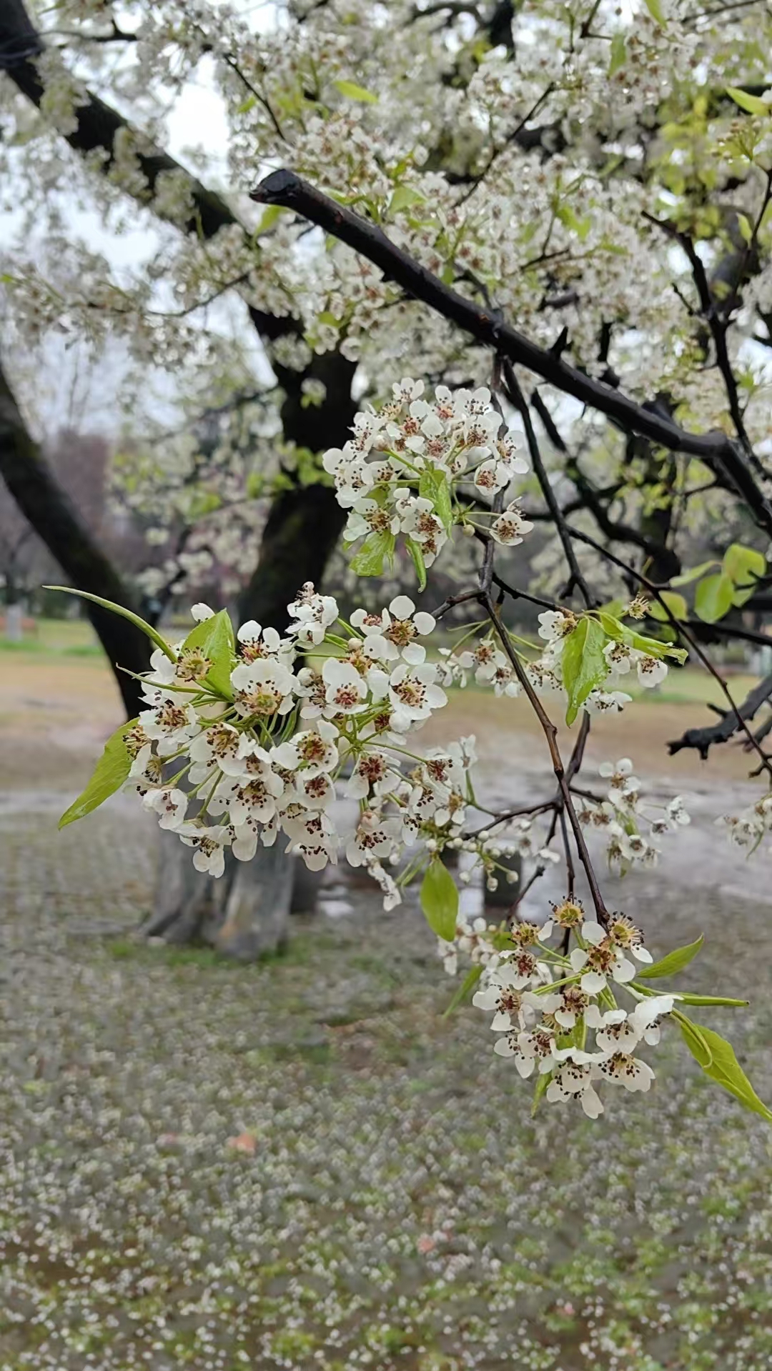 它的“臂展”宽大舒展,枝干苍劲有力,密集的雪白花朵一簇簇紧紧相拥,缀满每一根枝条,远看如一团团蓬松的云团挂在树梢,纯净又壮观,也因此被网友亲切誉为“武汉最美梨花”。