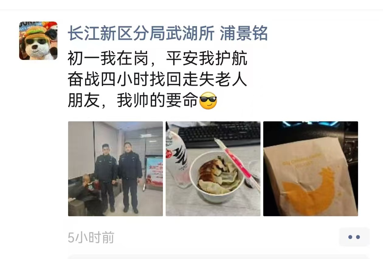 大年初一19时55分,长江新区公安分局武湖街派出所的报警电话突然响起,辖区徐奶奶急切求助:“警察同志,我老伴记性不好,下午出门到现在没回来,我们都找了两个多小时了……”