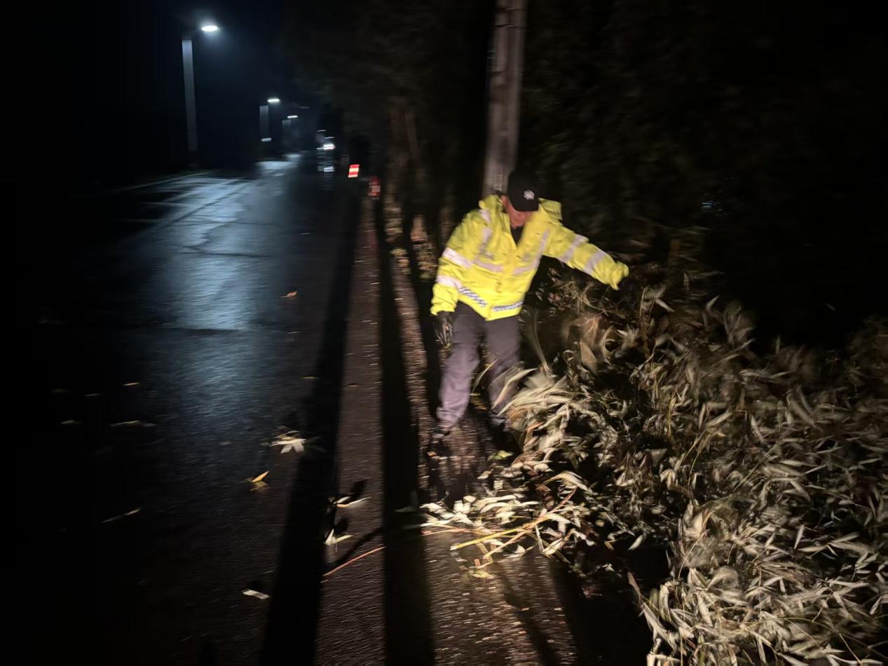 2月15日夜间,六指派出所新警董超在318国道巡逻时,发现一棵树因大风被连根吹倒,横卧在道路主车道中央,枝干散落。