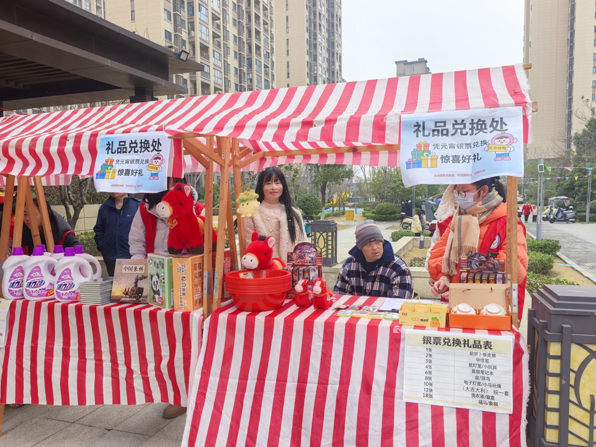 活动现场,志愿者们将热腾腾的汤圆免费分发给居民们品尝。集市另一侧由志愿者和阳光家园残疾学员负责的银票兑换区同样人气十足,灯笼、实用盆具、大吉大利碗、洗衣液、象棋、马年吉祥物等丰富礼品整齐摆放,居民们凭活动积攒的银票兑换心仪好物,脸上满是笑容。64岁的居民谢爹爹品尝着汤圆连连称赞,胡阿姨和老友相约而来,直呼活动热闹又有趣。