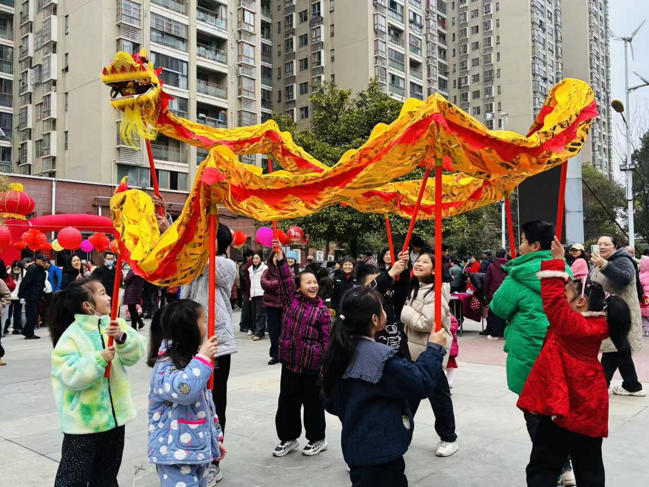 紧接着,“祥龙舞春·童趣飞扬”环节将现场气氛推向高潮——一支由社区儿童组成的小小舞龙队闪亮登场,孩子们手持彩龙,在广场上穿梭巡游、欢腾跳跃,灵动可爱的表演引得居民纷纷驻足拍照、喝彩不断,传统文化的种子也在欢声笑语中悄然播撒。
