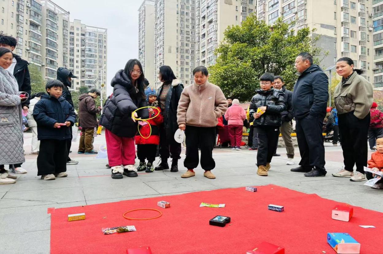 游戏区人气火爆,“一掷千金 马上转运”和“马上套福”两大趣味项目前排起了长队。居民们或投掷沙包瞄准“铜钱”,祈愿新年财运亨通;或手持套圈瞄准“福”桩,期待“马上有福”。欢笑声、喝彩声此起彼伏,大家在轻松愉悦的氛围中体验传统游戏的乐趣,也收获了满满的好运与祝福。