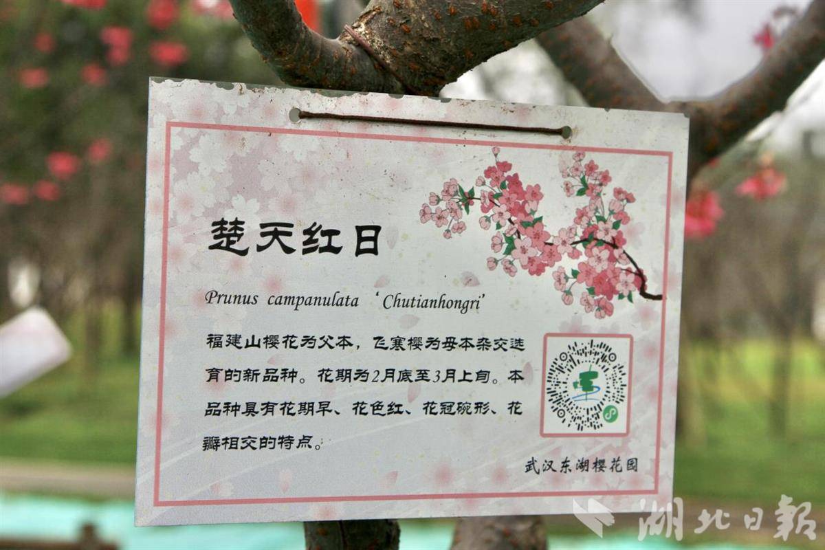 目前,园内早樱如楚天红日、楚天霞光、云南早樱等次第绽放,春意渐浓,景致宜人。“楚天霞光”和“楚天红日”均为“楚樱”品种,以早樱品种福建山樱为父本,与其他樱花杂交培育而成,2月下旬就可开花,是武汉地区花期最早的早樱品种之一。
