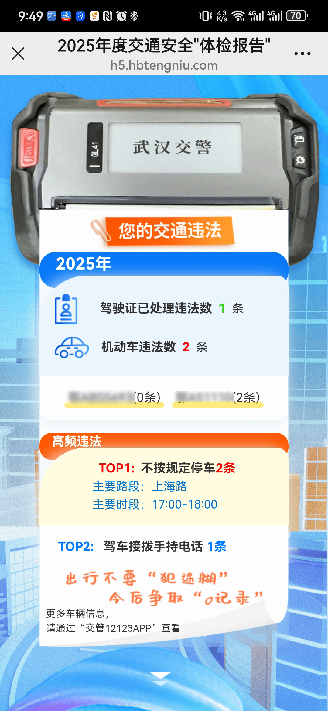 全年0事故,驾驶证累计记分0分,超棒!您这驾驶水平杠杠滴!近日,武汉人的微信朋友圈里,不少人晒出自己的“2025年度交通安全体检报告”。
