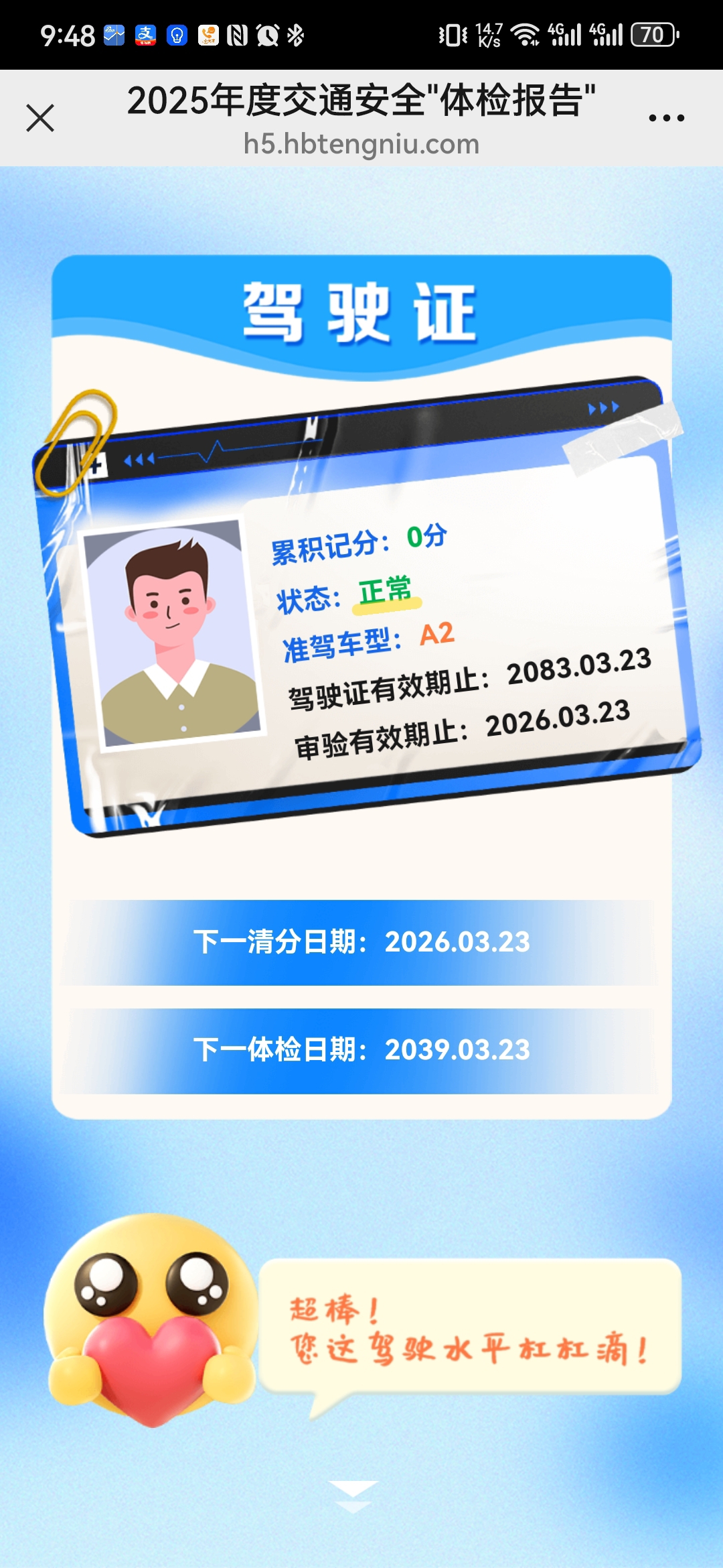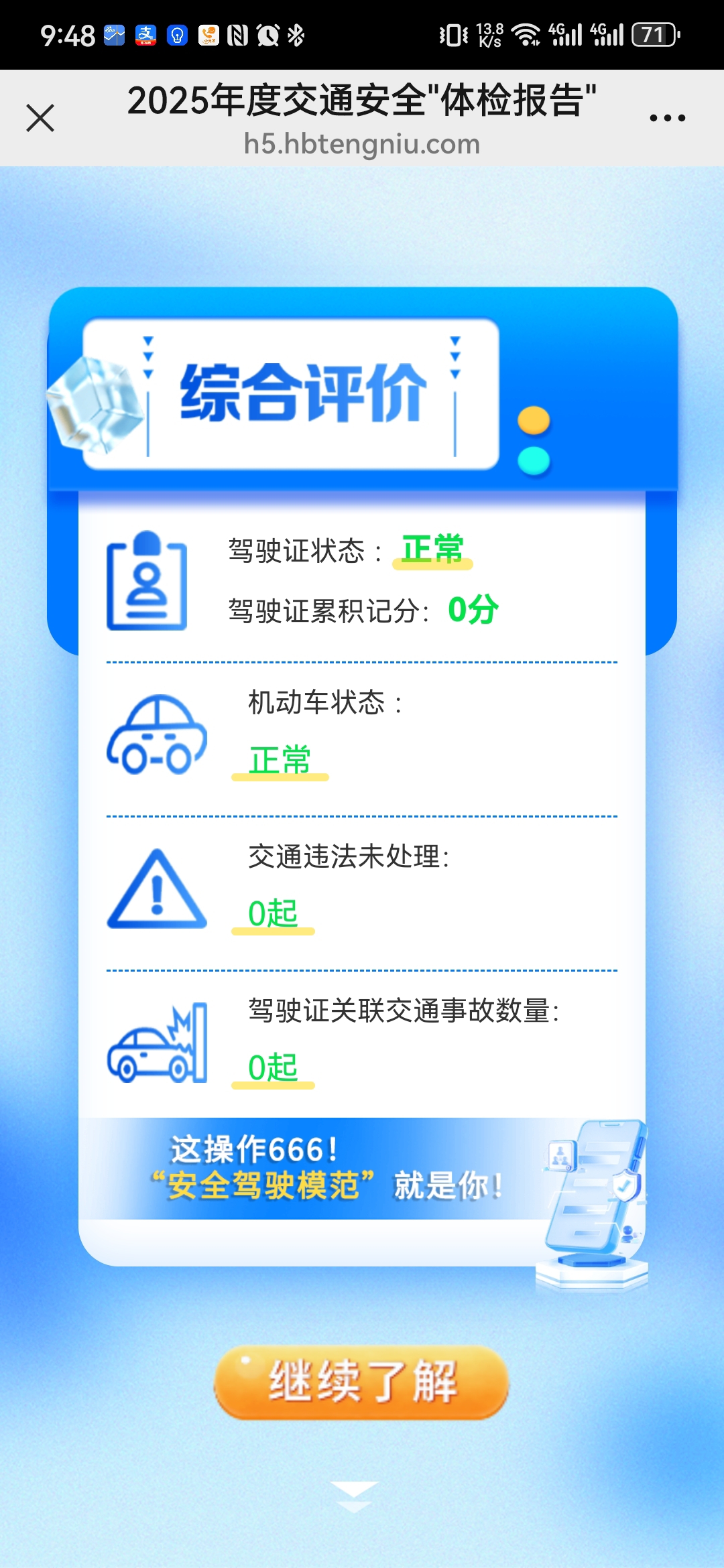 继续点击下方箭头,就收到了自己名下机动车状态信息,均为“正常”。“体检报告”给出积极的评价:状态拉满,司机好榜样!