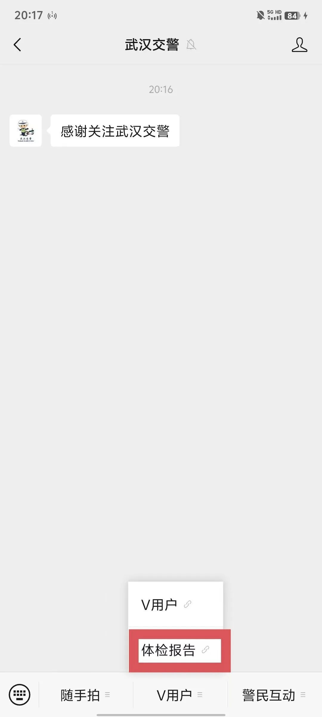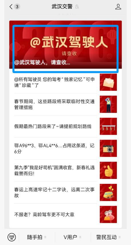 二是进入武汉交警微信服务号,在下方菜单栏中点击【V用户】、【体检报告】;