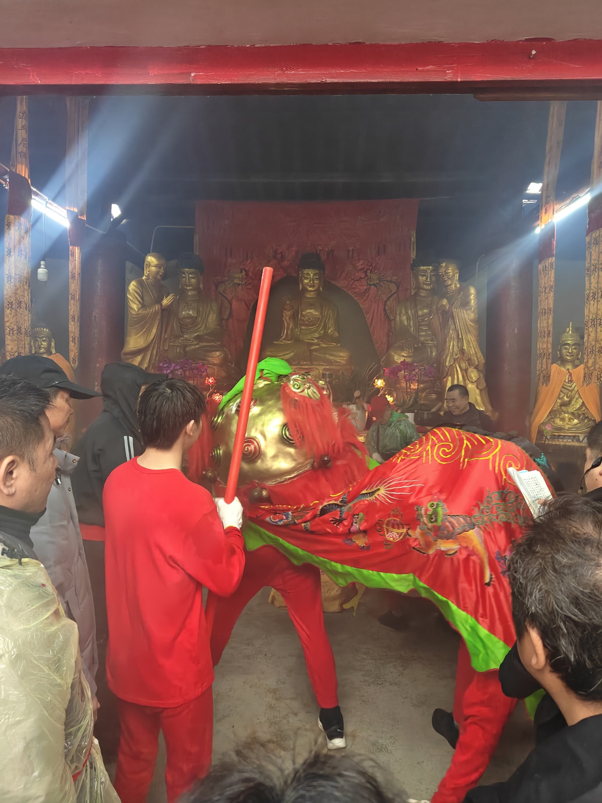 随着将军狮子的出现,将现场氛围推向顶峰。“马脚”身着大红色服饰,在缭绕的香火与激昂的锣鼓声中娴熟地舞动着狮子,狮头色彩鲜艳,每一个转身、每一次俯身,都引得围观群众阵阵喝彩,欢呼声、锣鼓声、交织在一起,在现场久久回荡。