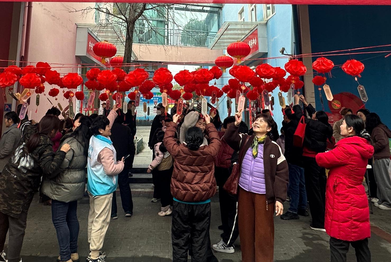 灯谜区更是热闹非凡,100条趣味灯谜悬挂在长廊中间,涵盖民俗知识、生活常识、趣味字谜等多个类别,居民们或独自思索,或结伴讨论,猜中谜底的可获得一份小礼品,现场一派其乐融融的景象。“社区每年元宵节都办得这么用心,猜灯谜、领奖品,热热闹闹的,太贴心了!”居民张阿姨手里拿着奖品,脸上笑开了花。