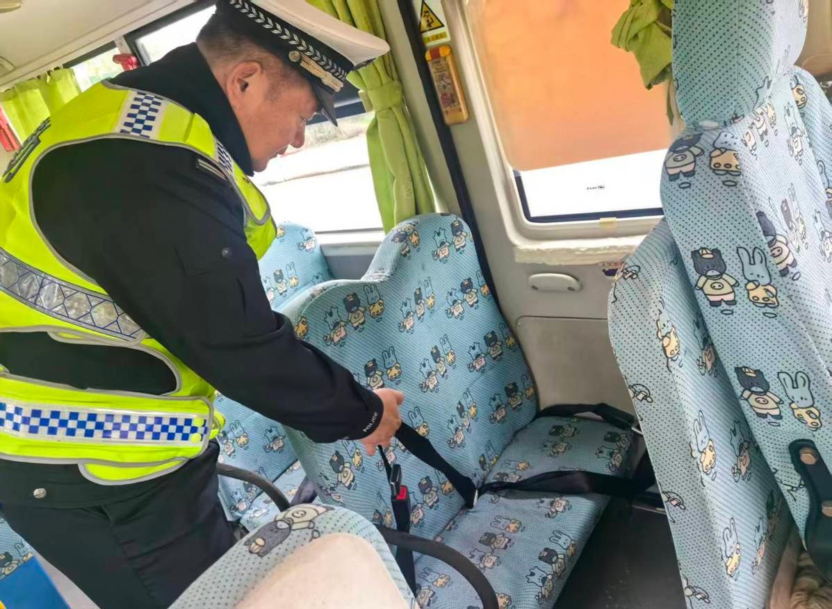 在检查现场,民警蹲下身仔细查验轮胎、刹车、灯光,动手测试安全带、灭火器、安全锤、应急逃生门等,仔细核对每一辆校车资质、年检情况和驾驶员资格。就在细致排查中,民警发现有车辆存在校车标牌登记驾驶员与实际驾驶人不一致的问题,当场严肃对校方负责人说:“校车驾驶员必须和标牌信息一致,这是硬性规定,更是安全底线!涉事车辆立刻整改,没整改好绝对不能参与营运!”