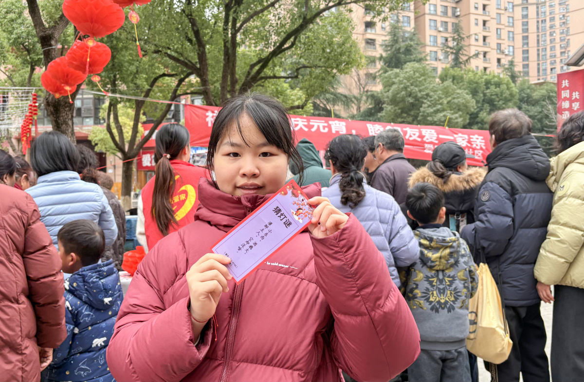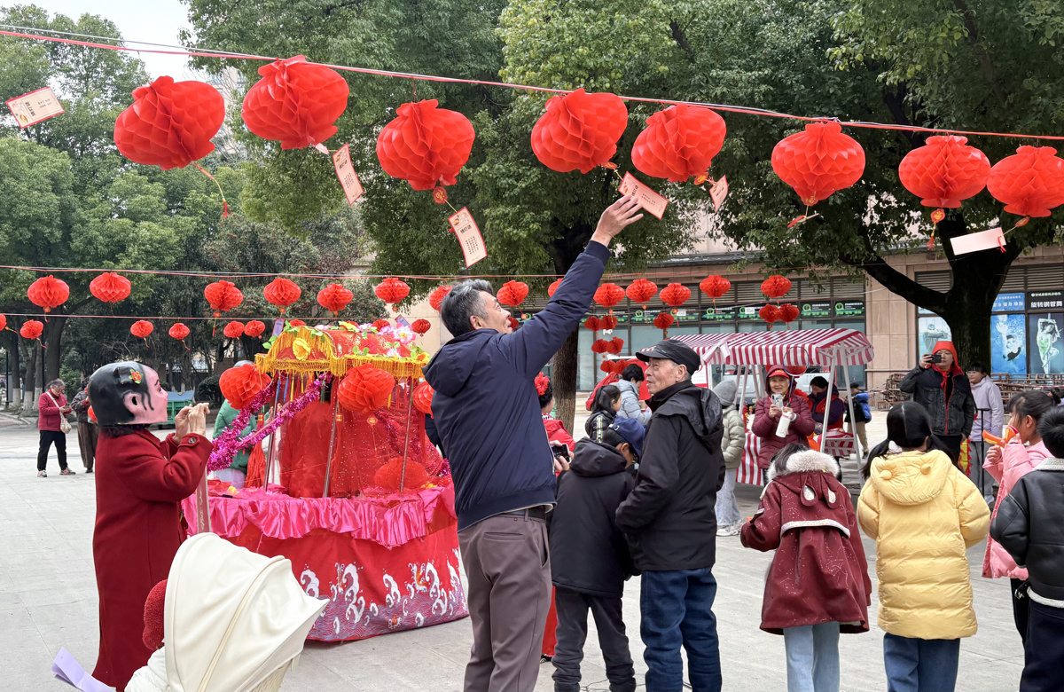 趣味游戏区热闹不断,诗词“灯”潮灯谜区挂满花艺灯笼,居民们你一言我一语地猜灯谜:“我知道这个答案!”“快帮我想想,这个是什么?”猜对的居民开心地盖上印章,成就感满满。