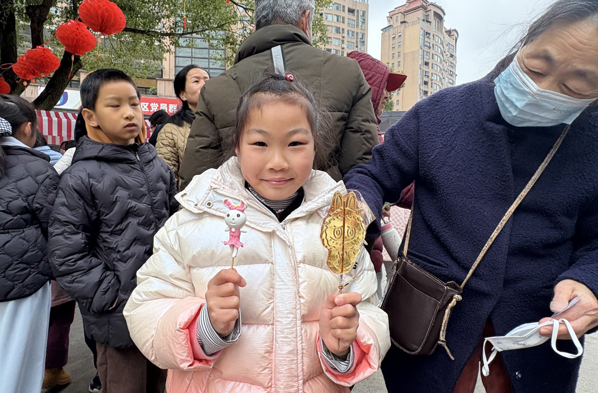 非遗体验区人气最旺,社区特别邀请非遗艺人现场展示糖画、面塑等技艺。“哇,这匹马画得真像!”孩子们围在糖画摊前挪不开脚,沉浸式感受传统手艺的独特魅力。非遗艺人以勺为笔、以糖为墨,几笔就勾勒出骏马、灯笼、蝴蝶等造型,晶莹剔透、香甜诱人。