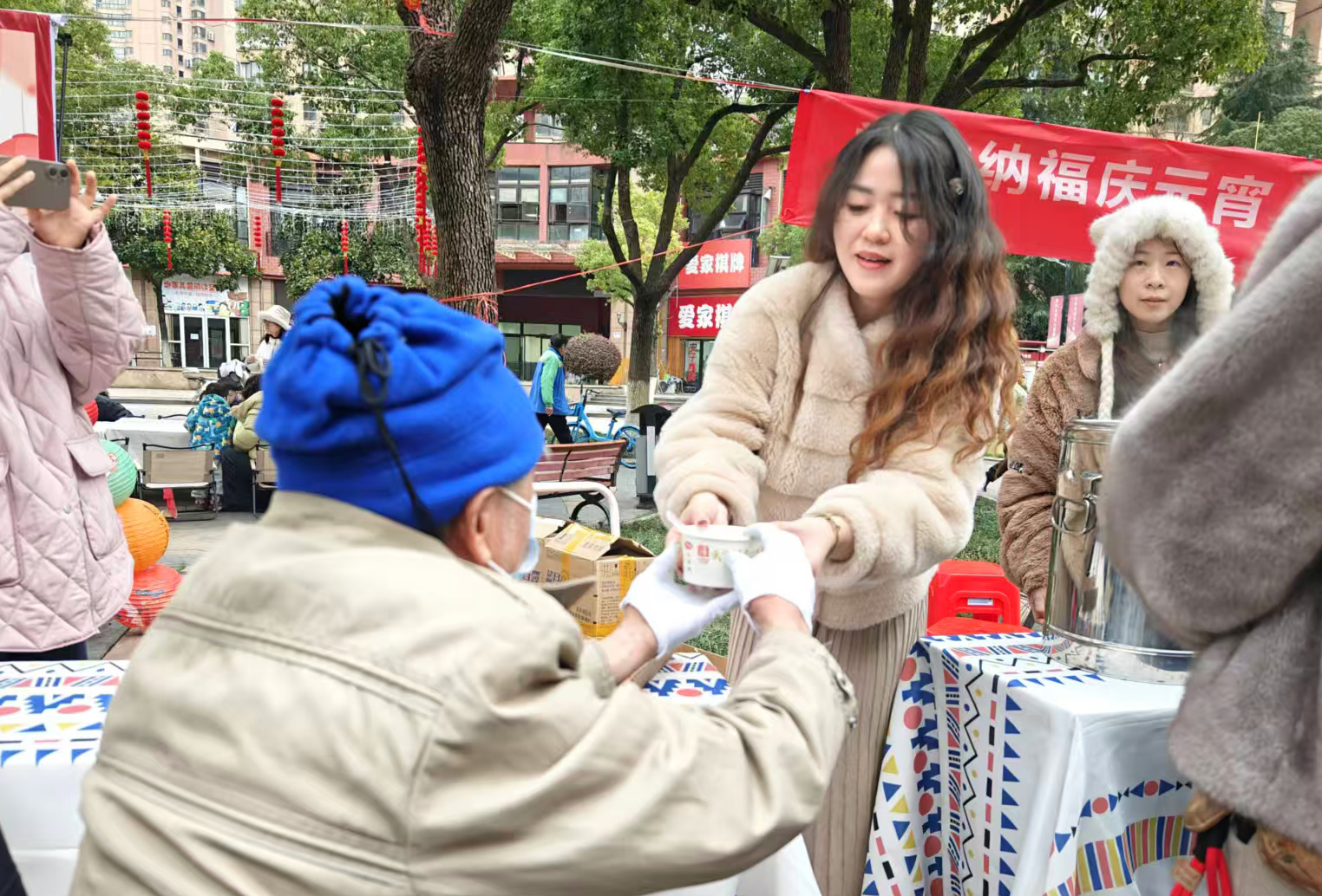 最暖心的环节莫过于暖心共享区,爱家国际社区老年人服务中心特意煮好了社区准备的香甜软糯芝麻汤圆,一碗碗汤圆热气腾腾;物业也贴心准备了棉花糖、暖心奶茶等小吃,免费分发给现场居民。大家围在一起,吃着汤圆、喝着热饮、聊着家常,原本陌生的邻居渐渐熟络,熟悉的邻里感情更近一步,小小的汤圆,成了连接邻里情谊最温暖的纽带。