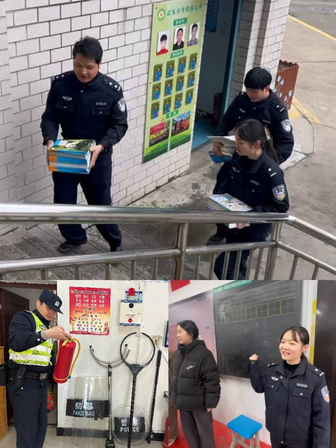 武东街派出所民警毛欧阳和申文丹检查灭火器、搬运教材