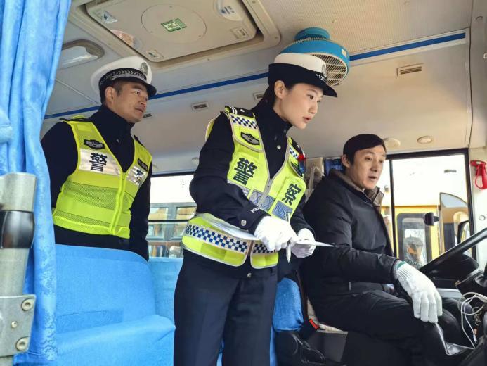 青山交通大队民警邬勇与刘敏检查校车