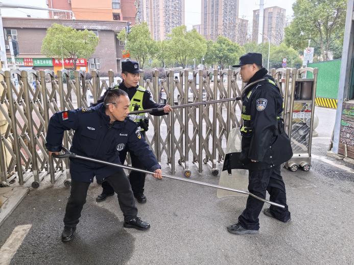 青山镇派出所民警肖坤雄指导学校安保人员进行防暴器械演练
