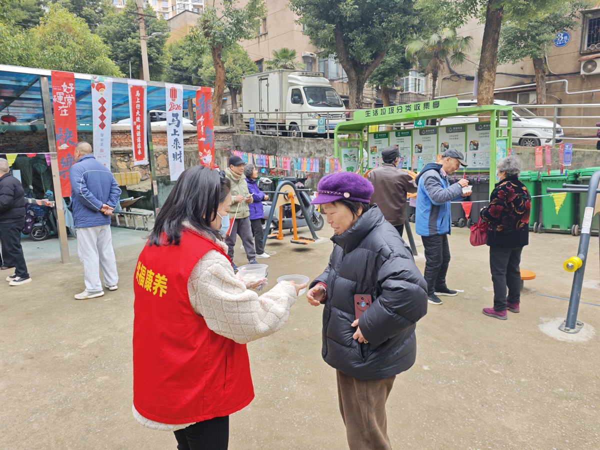 活动现场,长航小区内张灯结彩、年味十足,近两百位居民踊跃参与,现场气氛热烈。清晨8点,“健康送福”环节率先启动。社区联合辖区医疗机构关山街第一社区卫生服务中心,为65岁及以上老人提供免费体检服务。医护志愿者们耐心引导老人排队、登记,细致解答健康咨询,用专业服务守护老年人的健康福祉,让老人们感受到社区的关怀。