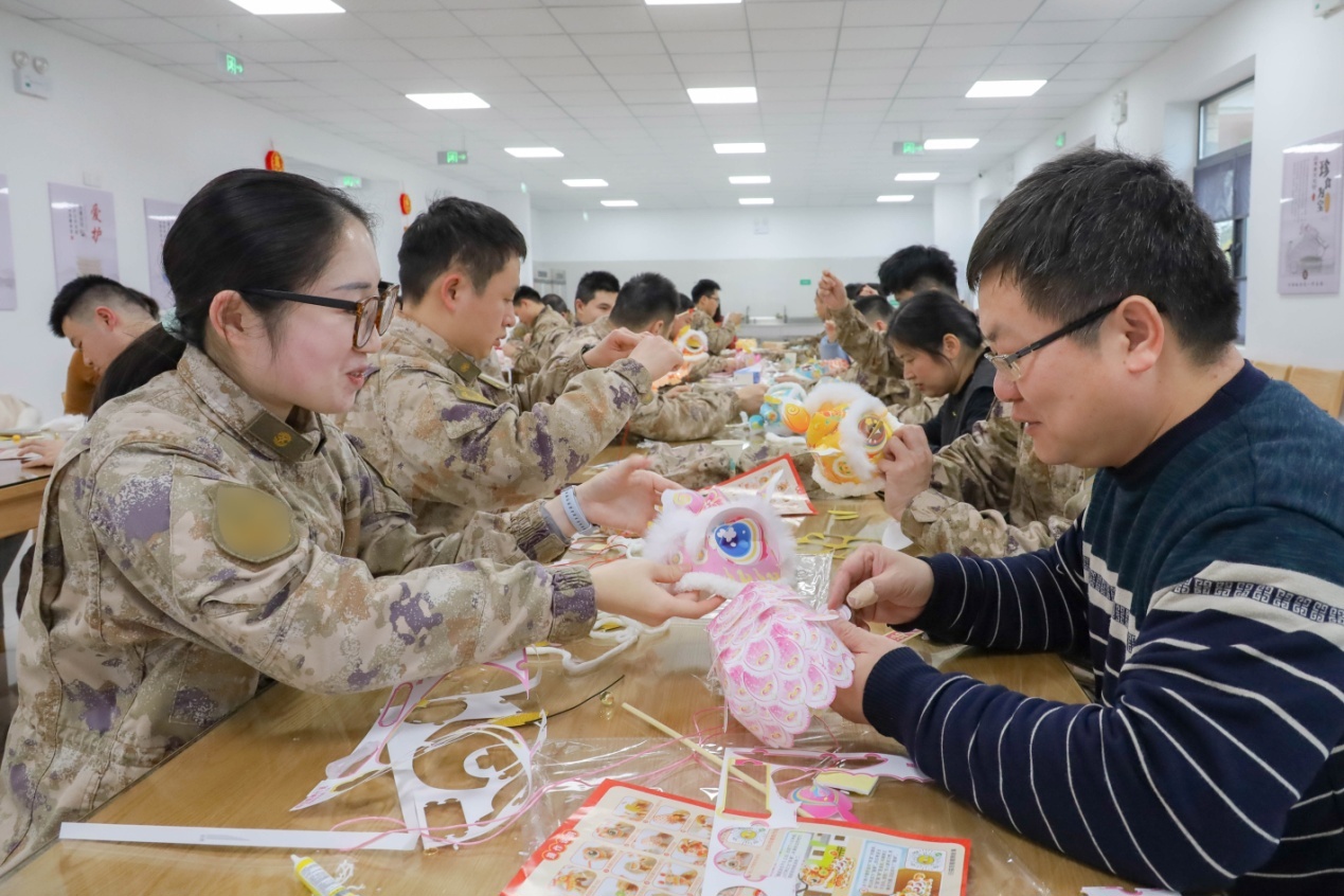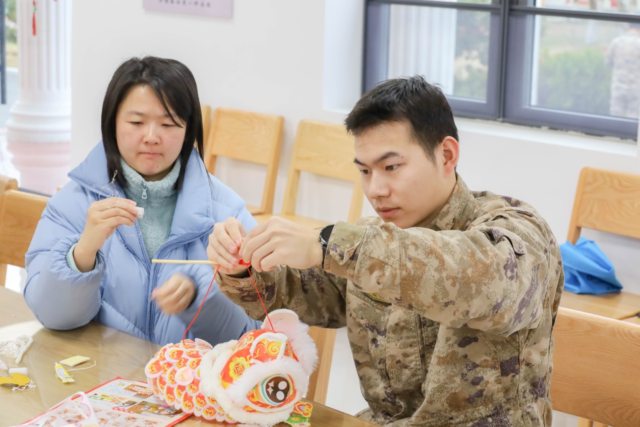 活动现场处处洋溢着喜庆祥和的节日氛围。官兵们早已摆好桌椅,备好彩纸、竹篾、糯米粉等材料。“来,咱们一起把灯骨架扎紧,这样花灯才结实。”活动伊始,做花灯环节便拉开帷幕。区退役军人事务局和区教育局干部与部队官兵们分工协作,折框架、糊彩纸、贴窗花、挂流苏,现场一派热火朝天的景象。大家手中的花灯样式各异,每一盏花灯都承载着军民同心的美好期许。
