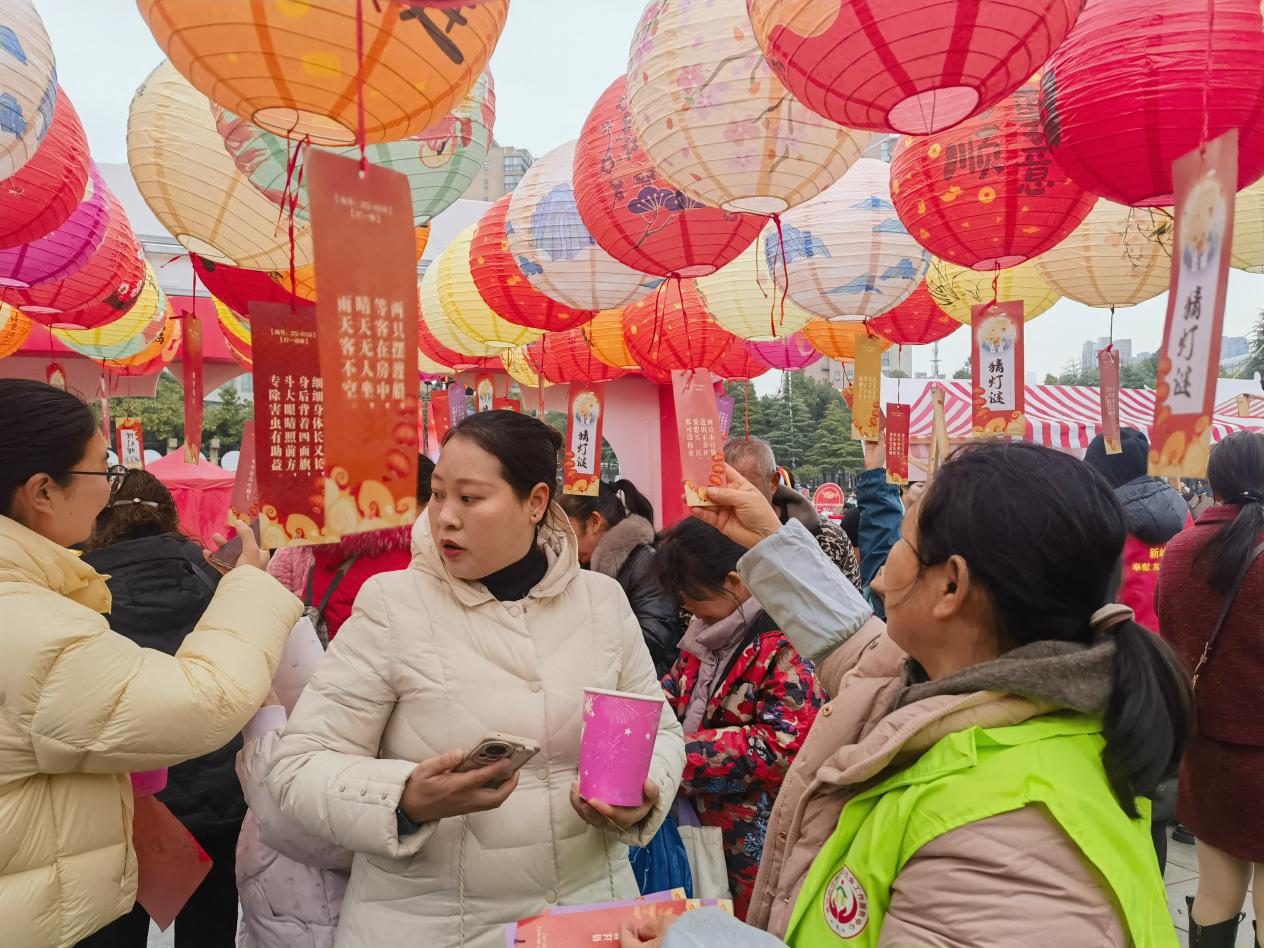 活动现场张灯结彩、热闹非凡。五彩灯笼长廊下,灯谜纸条迎风轻扬,内容涵盖传统文化、健康养生、生活常识等多个领域,融知识性、趣味性于一体,大家踊跃参与、乐在其中。