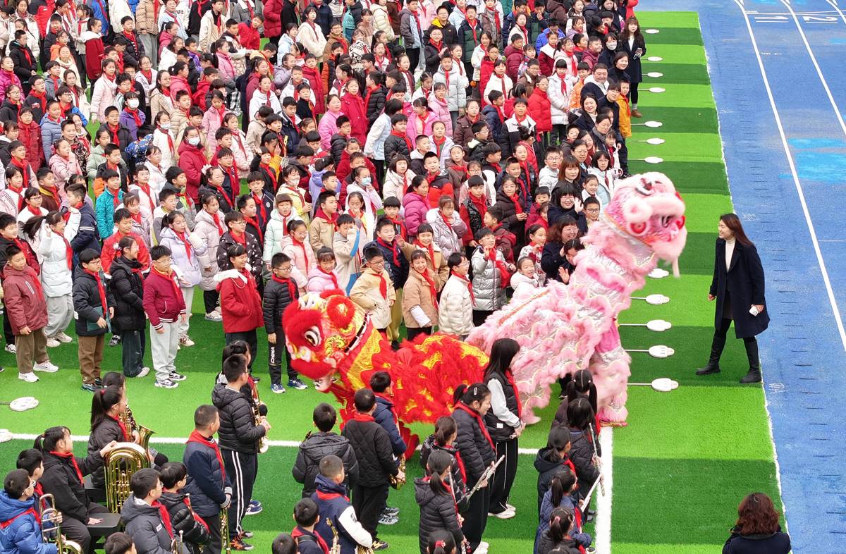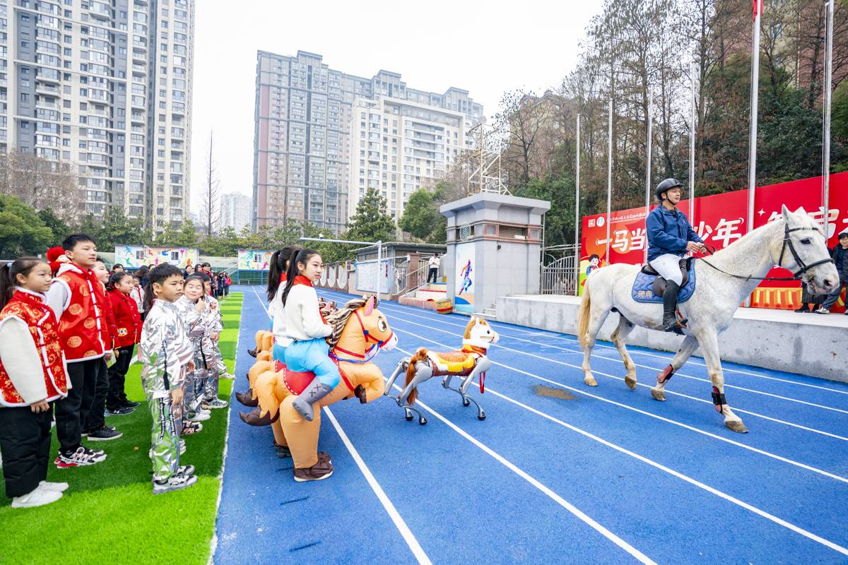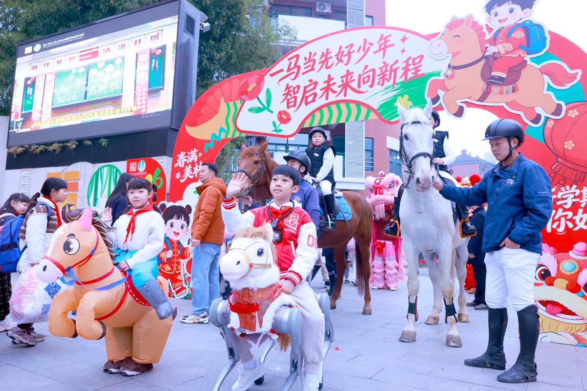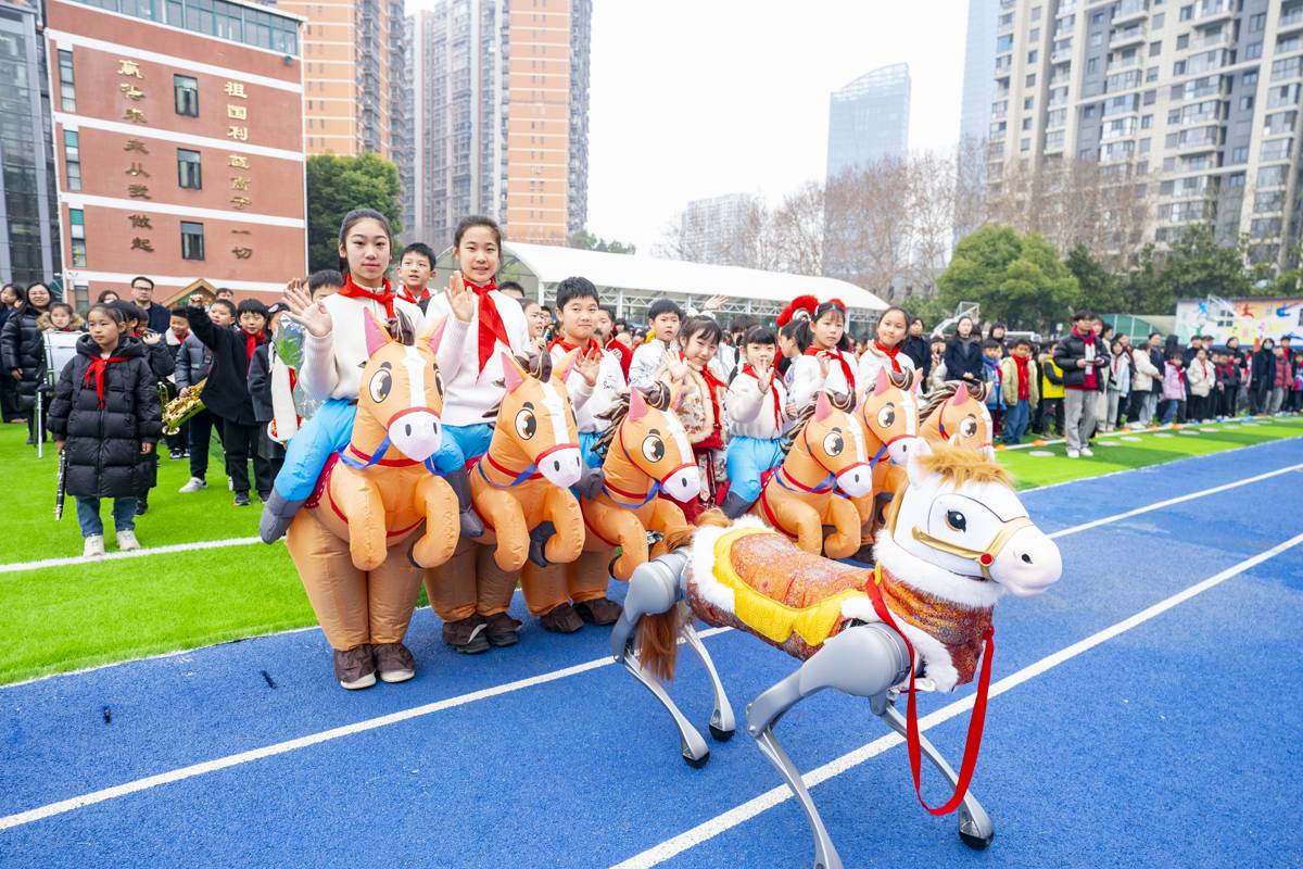 3月4日,武汉市洪山区未来实验外国语学校美林校区校门口,三匹省运会参赛骏马和一匹光谷造“小机器马”迎接学生们返校开学。开学典礼上,三匹骏马绕操场一周,三位骑士手持“一马当先”“马力全开”“马到成功”旗帜,把新学期最美好的祝福送给同学们。光谷造的“小机器马”,也和欢快的醒狮走到同学们中间一起迎接新学期的开始。(湖北日报全媒记者 魏铼 通讯员 雷迪 摄)