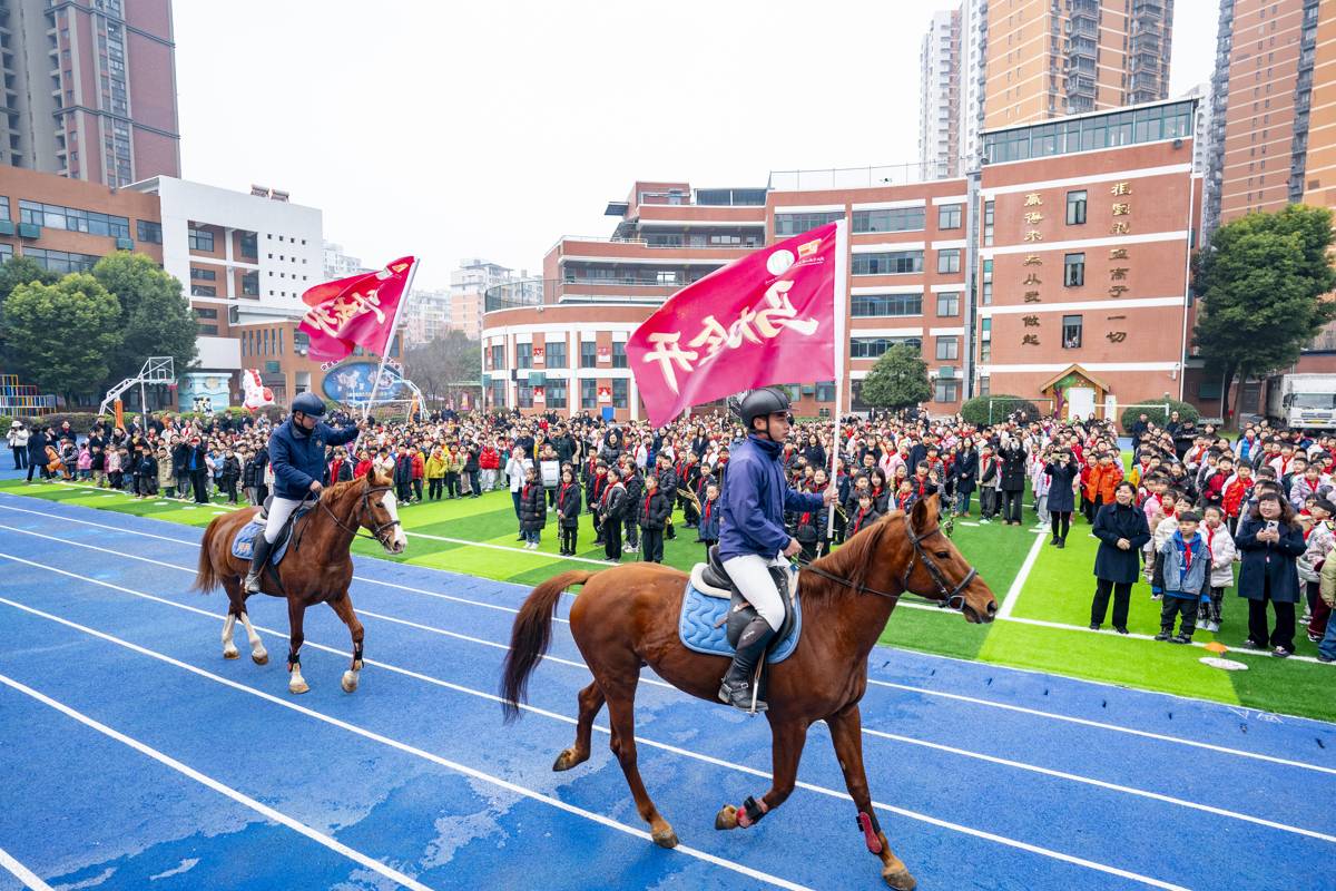 开学典礼上,三匹骏马绕操场一周,三位骑士手持“一马当先”“马力全开”“马到成功”旗帜,把新学期最美好的祝福送给同学们。