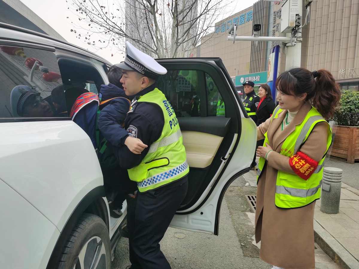 从早上7时起,以桥梁高架、学校周边为重点,清理违停、疏导交通。在解放大道水厂路小学门口,硚口区公安分局交管大队、汉水街派出所的交警和巡警,联合家长志愿者、学校老师一起,引导车辆有序停放,迅速打开车门,接学生下车,车辆随即驶离。在大家的共同努力下,每辆车可以缩短至少30秒的停靠时间,做到“即停即走”,既安全又便捷,筑起一道保安全护畅通的坚实屏障。