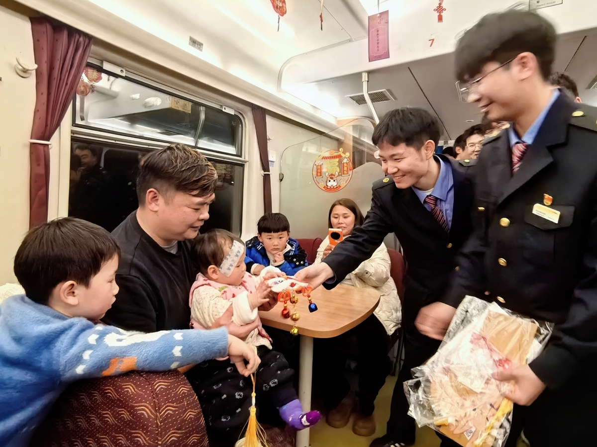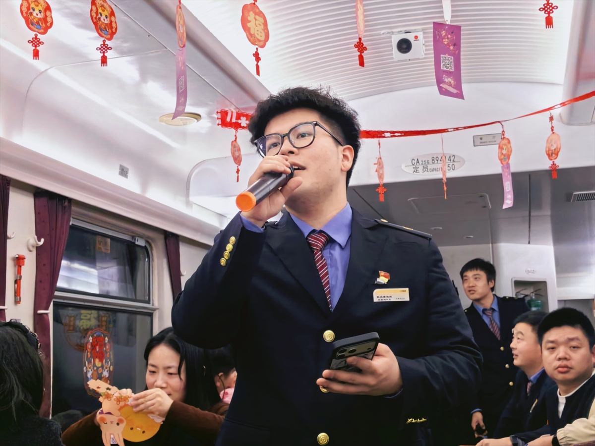 “白如玉,穿黄袍,只有一点大,都是宝中宝——打一传统食物”“叔叔,是大米”“恭喜小朋友!请工作人员送上小礼物。”猜灯谜活动一开始便吸引了众多旅客和小朋友的热情参与。为了活跃气氛,列车工作人员精心准备了各式各样的灯谜,内容涵盖节日文化、生活常识、趣味谐音及列车安全提示等。每猜对一个灯谜,就能收获一份小礼品。当主持人念出谜头后,大家争先恐后举手抢答,整个车厢中洋溢着喜庆、幸福的气息。