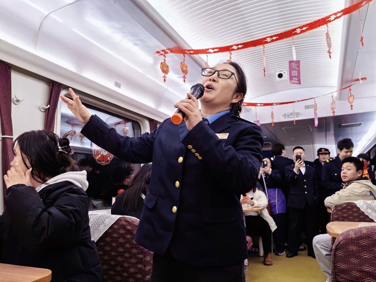 “一支竹篙耶,难渡汪洋海,众人划桨哟 开动大帆船……”21时40分,列车从武昌火车站开车不久后,随着音乐的响起,临客列车员何玉梅的一首《众人划桨开大船》拉开了元宵晚会的序幕,铿锵的歌声穿透车厢,脉动的旋律传递着团圆的喜悦,车厢内不时传来阵阵掌声,大家纷纷拿起手机记录这一温馨的时刻。