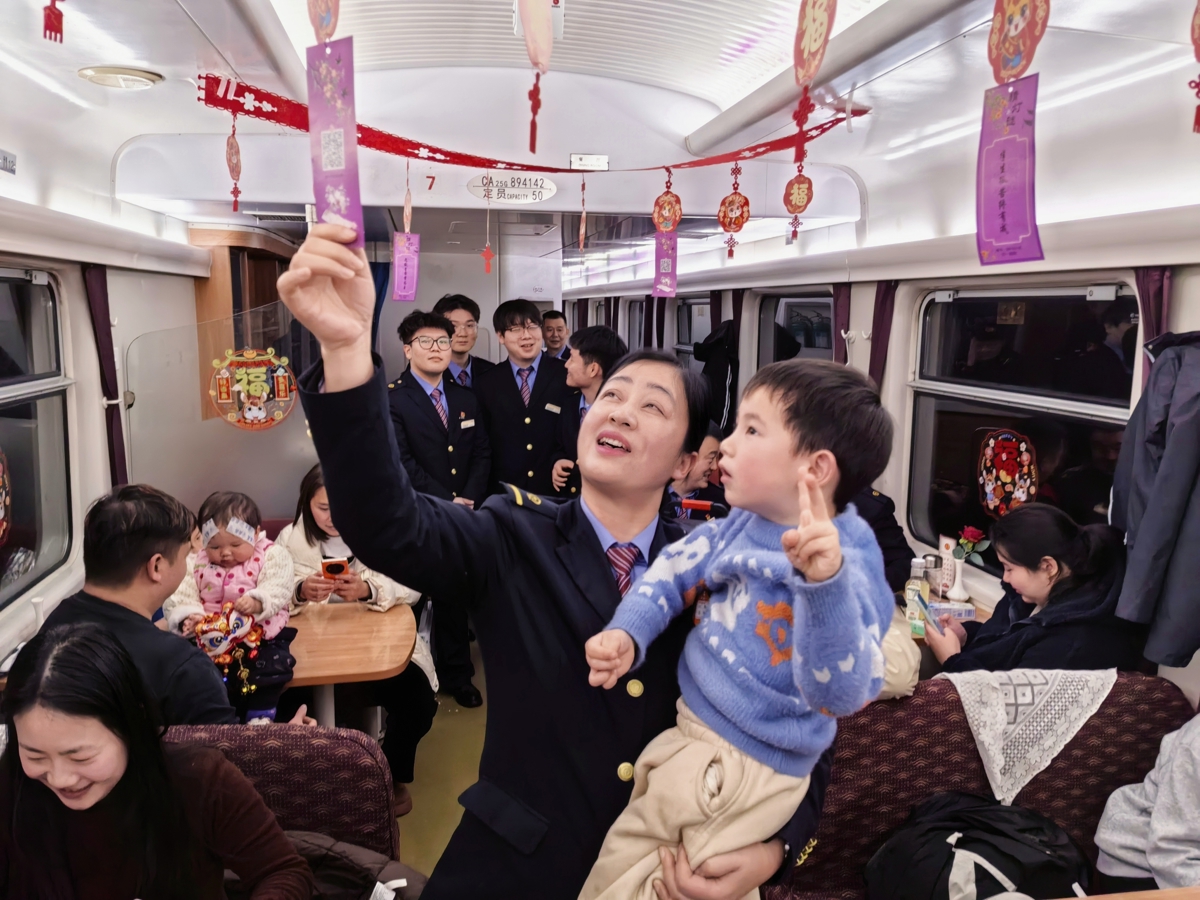 令人心潮澎湃的是“击鼓传花”环节,当音乐响起,灯笼依次传递,音乐停下后灯笼传到谁的手中就起身送上一句元宵祝福,“阖家幸福”“万事圆满”……一声声祝愿让福气传满整个车厢。