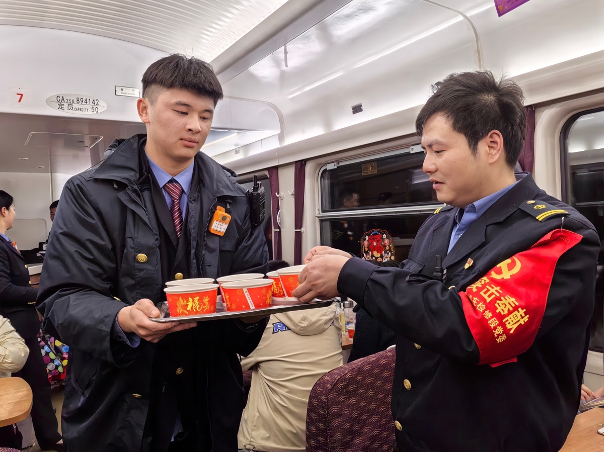 走进餐车,火红的灯笼、多彩的灯谜、喜庆的福字挂满车厢,餐车工作人员正忙着为旅客准备汤圆,处处洋溢着浓浓的节日氛围。来自汉口的张女士一边打卡车厢美景,一边忍不住点赞。为了筹备好此次活动,担当该趟临客列车的中国铁路武汉局集团有限公司武汉大功率机车检修段的一群“00后”临客乘务员和武汉客运段南线乘务车间的工作人员早早来到列车上,在车厢内贴窗花、贴福字,挂上喜庆的灯笼和灯谜,让列车成为承载团圆期盼的“移动家园”。
