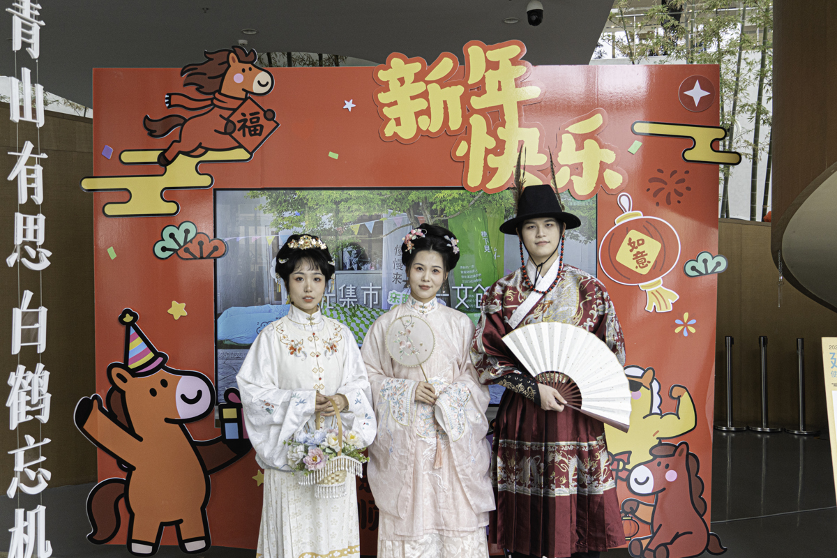 区图书馆内,“新春阅彩,非比寻常”春节游园会人气高涨。活动设置猜灯谜、画元宵等体验项目,市民完成挑战后可集章兑换文创礼品。现场还有汉服爱好者与市民互动合影,成为年轻群体的热门打卡点。