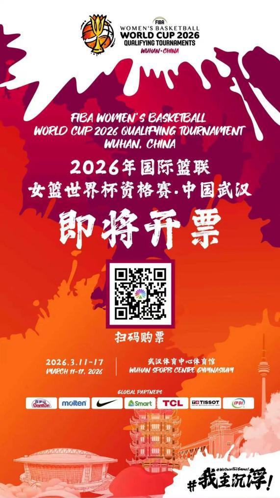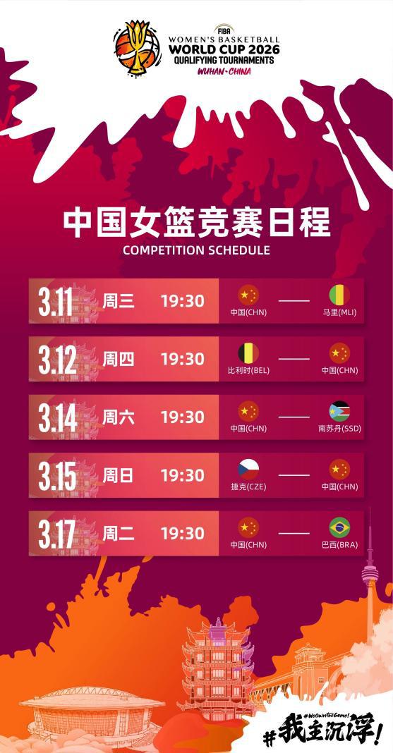 3月11日至17日,2026年国际篮联女篮世界杯资格赛(武汉赛区)将在武汉体育中心体育馆火热开打!中国女篮将开启7天5场的高强度征程,主场迎战马里、比利时、南苏丹、捷克、巴西等劲旅,全力冲击德国柏林世界杯门票!中国女篮将在每个比赛日19:30黄金时段登场,方便球迷共赴热血之约。