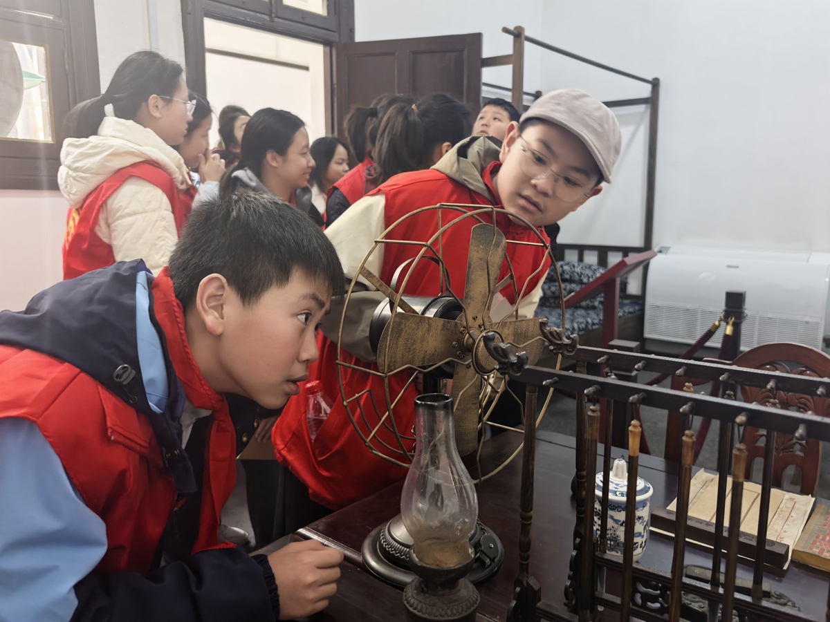 在讲解员的引导下,学生们缓缓走过每一个房间,从点滴痕迹中感受历史的温度。讲解员指着桌上的煤油灯,轻声说道:“当年刘少奇同志就在这盏灯下写文件,经常写到半夜。”卧室里,一张木床、一张书桌、一把椅子,陈设简单到极致,却让在场的学生们深受触动。