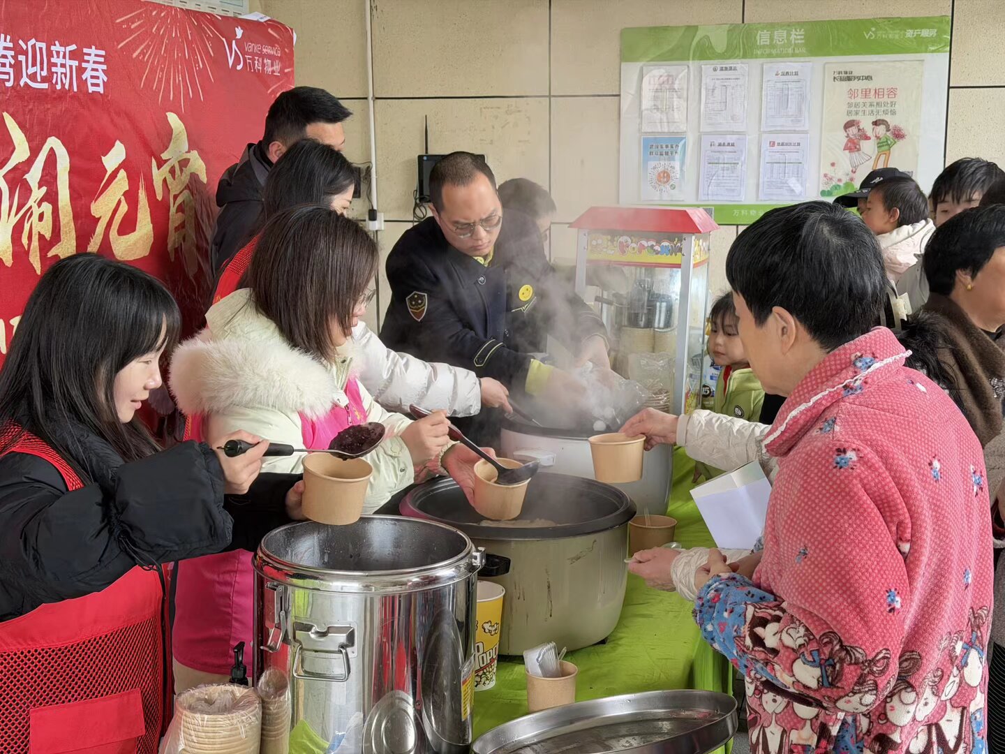 活动现场暖意融融、秩序井然,各功能区域的设置既贴合居民需求,更凸显了联建单位的服务特色。美食区由社区与万科物业工作人员共同值守,现煮现盛的汤圆圆润饱满,搭配热气腾腾的饺子、营养醇厚的八宝粥及香甜酥脆的爆米花,全方位满足不同年龄段居民的口味需求。