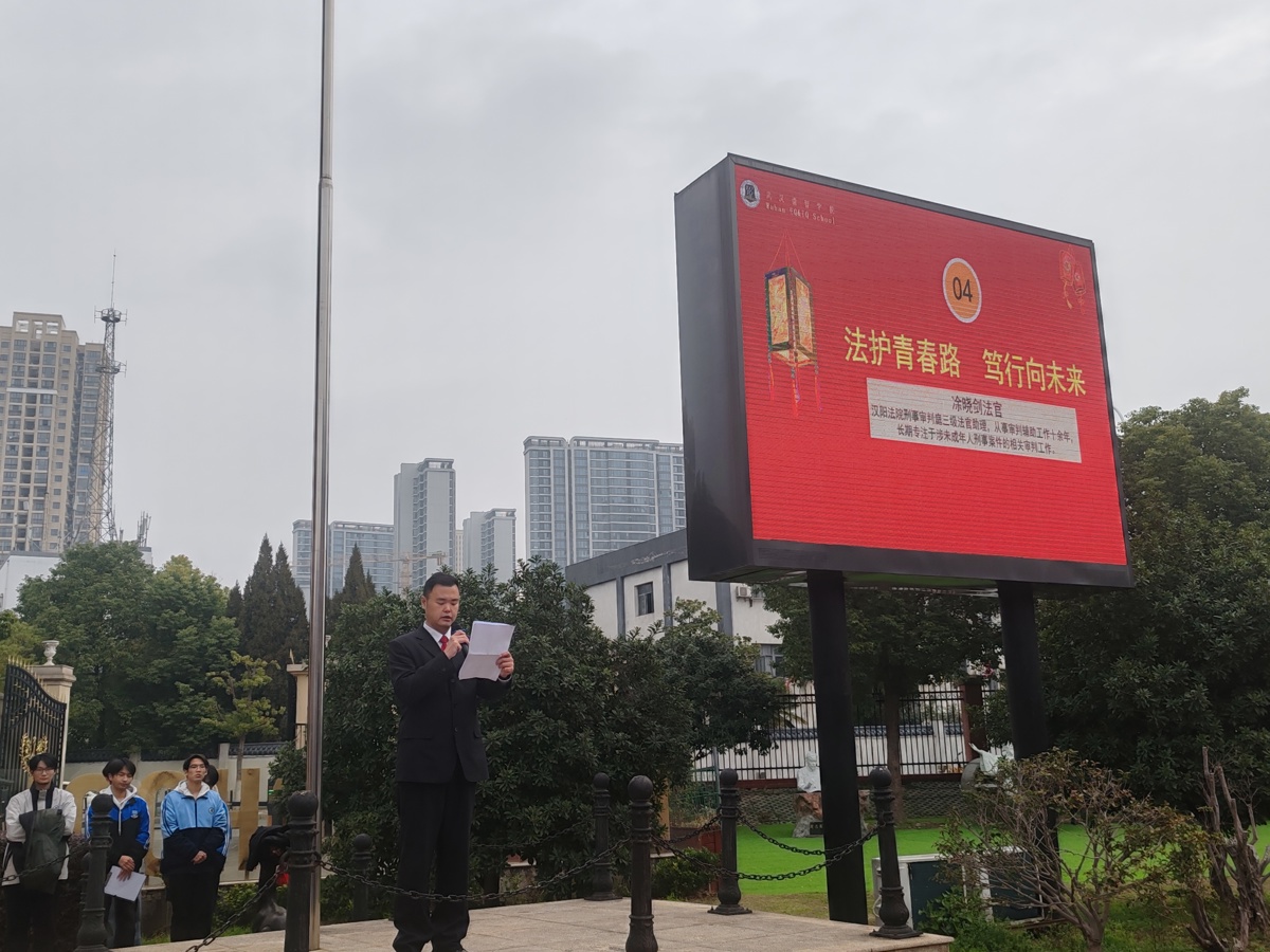 为进一步加强未成年人法治宣传教育,推动法治校园、平安校园建设,在新学期开学之际,武汉市汉阳区人民法院刑庭干警应邀前往芳草高级中学和武汉情智学校参加升国旗仪式。
